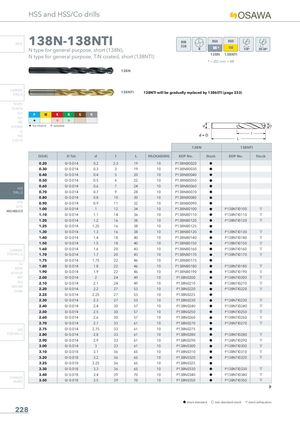 HSS and HSS/Co drills INFO 138N-138NTI DIN338 N type for general purpose, short (138N), N type for general purpose, TiN coated, short (138NTI) 138N 138NTI * < Ø2 mm = BR 138N CARBIDEDRILLS 138NTI 138NTI will be gradually replaced by 1386STI (page 233) PU-HPU TA-4HTA SUH P M K N S H ALH HRC H I I SUH MINI H 1st choice I suitable HL HSD C-SD-TA 138N 138NTI D(h8) D Tol. d l L PACKAGING EDP No. Stock EDP No. Stock 0.20 0/-0.014 0.2 2.5 19 10 P138NB0020 h 0.30 0/-0.014 0.3 3 19 10 P138NB0030 h 0.40 0/-0.014 0.4 5 20 10 P138NB0040 h 0.50 0/-0.014 0.5 6 22 10 P138NB0050 h 0.60 0/-0.014 0.6 7 24 10 P138NB0060 h HSS DRILLS 0.70 0/-0.014 0.7 9 28 10 P138NB0070 h 0.80 0/-0.014 0.8 10 30 10 P138NB0080 h LFTA 0.90 0/-0.014 0.9 11 32 10 P138NB0090 h SUTAHSS-HSS/CO1.00 0/-0.014 1 12 34 10 P138NB0100 h P138NTI0100 m 1.10 0/-0.014 1.1 14 36 10 P138NB0110 h P138NTI0110 m 1.20 0/-0.014 1.2 16 38 10 P138NB0120 h P138NTI0120 m 1.25 0/-0.014 1.25 16 38 10 P138NB0125 h 1.30 0/-0.014 1.3 16 38 10 P138NB0130 h P138NTI0130 m 1.40 0/-0.014 1.4 18 40 10 P138NB0140 h P138NTI0140 m 1.50 0/-0.014 1.5 18 40 10 P138NB0150 h P138NTI0150 m CARBIDE 1.60 0/-0.014 1.6 20 43 10 P138NB0160 h P138NTI0160 m END-MILLS 1.70 0/-0.014 1.7 20 43 10 P138NB0170 h P138NTI0170 m 1.75 0/-0.014 1.75 22 46 10 P138NB0175 h G2 1.80 0/-0.014 1.8 22 46 10 P138NB0180 h P138NTI0180 m MDTA HF VH/UP 1.90 0/-0.014 1.9 22 46 10 P138NB0190 h P138NTI0190 m MEF 2.00 0/-0.014 2 24 49 10 P138N0200 h P138NTI0200 m ALU 2.10 0/-0.014 2.1 24 49 10 P138N0210 h P138NTI0210 m MEX/MHUH/MH 2.20 0/-0.014 2.2 27 53 10 P138N0220 h P138NTI0220 m 2.25 0/-0.014 2.25 27 53 10 P138N0225 h 2.30 0/-0.014 2.3 27 53 10 P138N0230 h P138NTI0230 m 2.40 0/-0.014 2.4 30 57 10 P138N0240 h P138NTI0240 m 2.50 0/-0.014 2.5 30 57 10 P138N0250 h P138NTI0250 m 2.60 0/-0.014 2.6 30 57 10 P138N0260 h P138NTI0260 m 2.70 0/-0.014 2.7 33 61 10 P138N0270 h P138NTI0270 m HSS 2.75 0/-0.014 2.75 33 61 10 P138N0275 h END-MILLS 2.80 0/-0.014 2.8 33 61 10 P138N0280 h P138NTI0280 m 2.90 0/-0.014 2.9 33 61 10 P138N0290 h P138NTI0290 m 3.00 0/-0.014 3 33 61 10 P138N0300 h P138NTI0300 m 3.10 0/-0.018 3.1 36 65 10 P138N0310 h P138NTI0310 m 3.20 0/-0.018 3.2 36 65 10 P138N0320 h P138NTI0320 m 3.25 0/-0.018 3.25 36 65 10 P138N0325 h 3.30 0/-0.018 3.3 36 65 10 P138N0330 h P138NTI0330 m 3.40 0/-0.018 3.4 39 70 10 P138N0340 h P138NTI0340 m CARBIDEBURRS 3.50 0/-0.018 3.5 39 70 10 P138N0350 h P138NTI0350 m h stock standard f non-standard stock m stock exhaustion 228