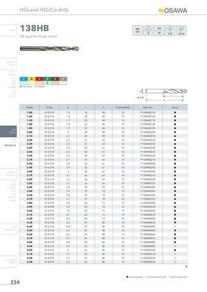 HSS and HSS/Co drills INFO 138HB DIN338 HB type for brass, short CARBIDE DRILLS PU-HPU TA-4HTA SUH P M K N S H ALH HRC H SUH MINI H 1st choice I suitable HL HSD C-SD-TA D(h8) D Tol. d l L PACKAGING EDP No. Stock 1.50 0/-0.014 1.5 18 40 10 P138HB0150 h 1.60 0/-0.014 1.6 20 43 10 P138HB0160 h 1.70 0/-0.014 1.7 20 43 10 P138HB0170 h 1.80 0/-0.014 1.8 22 46 10 P138HB0180 h 1.90 0/-0.014 1.9 22 46 10 P138HB0190 h HSS DRILLS 2.00 0/-0.014 2 24 49 10 P138HB0200 h 2.10 0/-0.014 2.1 24 49 10 P138HB0210 h LFTA 2.20 0/-0.014 2.2 27 53 10 P138HB0220 h SUTAHSS-HSS/CO2.30 0/-0.014 2.3 27 53 10 P138HB0230 h 2.40 0/-0.014 2.4 30 57 10 P138HB0240 h 2.50 0/-0.014 2.5 30 57 10 P138HB0250 h 2.60 0/-0.014 2.6 30 57 10 P138HB0260 h 2.70 0/-0.014 2.7 33 61 10 P138HB0270 h 2.80 0/-0.014 2.8 33 61 10 P138HB0280 h 2.90 0/-0.014 2.9 33 61 10 P138HB0290 h CARBIDE 3.00 0/-0.014 3 33 61 10 P138HB0300 h END-MILLS 3.10 0/-0.018 3.1 36 65 10 P138HB0310 h 3.20 0/-0.018 3.2 36 65 10 P138HB0320 h G2 3.30 0/-0.018 3.3 36 65 10 P138HB0330 h MDTA HF VH/UP 3.40 0/-0.018 3.4 39 70 10 P138HB0340 h MEF 3.50 0/-0.018 3.5 39 70 10 P138HB0350 h ALU 3.60 0/-0.018 3.6 39 70 10 P138HB0360 h MEX/MHUH/MH 3.70 0/-0.018 3.7 39 70 10 P138HB0370 h 3.80 0/-0.018 3.8 43 75 10 P138HB0380 h 3.90 0/-0.018 3.9 43 75 10 P138HB0390 h 4.00 0/-0.018 4 43 75 10 P138HB0400 h 4.10 0/-0.018 4.1 43 75 10 P138HB0410 h 4.20 0/-0.018 4.2 43 75 10 P138HB0420 h 4.30 0/-0.018 4.3 47 80 10 P138HB0430 h HSS 4.40 0/-0.018 4.4 47 80 10 P138HB0440 f END-MILLS 4.50 0/-0.018 4.5 47 80 10 P138HB0450 h 4.60 0/-0.018 4.6 47 80 10 P138HB0460 h 4.70 0/-0.018 4.7 47 80 10 P138HB0470 h 4.80 0/-0.018 4.8 52 86 10 P138HB0480 h 4.90 0/-0.018 4.9 52 86 10 P138HB0490 f 5.00 0/-0.018 5 52 86 10 P138HB0500 h 5.10 0/-0.018 5.1 52 86 10 P138HB0510 f 5.20 0/-0.018 5.2 52 86 10 P138HB0520 f CARBIDEBURRS 5.30 0/-0.018 5.3 52 86 10 P138HB0530 f h stock standard f non-standard stock m stock exhaustion 234