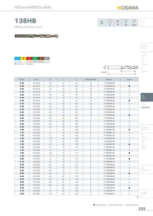 HSS and HSS/Co drills 138HB DIN338 INFO HB type for brass, short CARBIDE DRILLS PU-HPU TA-4HTA P M K N S H SUH ALH H HRC H 1st choice I suitable SUH MINI HL HSD C-SD-TA D(h8) D Tol. d l L PACKAGING EDP No. Stock 5.40 0/-0.018 5.4 57 93 10 P138HB0540 f 5.50 0/-0.018 5.5 57 93 10 P138HB0550 h 5.60 0/-0.018 5.6 57 93 10 P138HB0560 f 5.70 0/-0.018 5.7 57 93 10 P138HB0570 f 5.80 0/-0.018 5.8 57 93 10 P138HB0580 f HSS 5.90 0/-0.018 5.9 57 93 10 P138HB0590 f DRILLS 6.00 0/-0.018 6 57 93 10 P138HB0600 h 6.10 0/-0.022 6.1 63 101 10 P138HB0610 f LFTA 6.20 0/-0.022 6.2 63 101 10 P138HB0620 f SUTAHSS-HSS/CO 6.30 0/-0.022 6.3 63 101 10 P138HB0630 f 6.40 0/-0.022 6.4 63 101 10 P138HB0640 f 6.50 0/-0.022 6.5 63 101 10 P138HB0650 h 6.60 0/-0.022 6.6 63 101 5 P138HB0660 f 6.70 0/-0.022 6.7 63 101 5 P138HB0670 f 6.80 0/-0.022 6.8 69 109 5 P138HB0680 f 6.90 0/-0.022 6.9 69 109 5 P138HB0690 f CARBIDE 7.00 0/-0.022 7 69 109 5 P138HB0700 h END-MILLS 7.10 0/-0.022 7.1 69 109 5 P138HB0710 f 7.20 0/-0.022 7.2 69 109 5 P138HB0720 f G2 MDTA 7.30 0/-0.022 7.3 69 109 5 P138HB0730 f HF VH/UP 7.40 0/-0.022 7.4 69 109 5 P138HB0740 f MEF 7.50 0/-0.022 7.5 69 109 5 P138HB0750 h ALU 7.60 0/-0.022 7.6 75 117 5 P138HB0760 f MEX/MHUH/MH 7.70 0/-0.022 7.7 75 117 5 P138HB0770 f 7.80 0/-0.022 7.8 75 117 5 P138HB0780 h 7.90 0/-0.022 7.9 75 117 5 P138HB0790 f 8.00 0/-0.022 8 75 117 5 P138HB0800 h 8.10 0/-0.022 8.1 75 117 5 P138HB0810 f 8.20 0/-0.022 8.2 75 117 5 P138HB0820 f 8.30 0/-0.022 8.3 75 117 5 P138HB0830 f HSS 8.40 0/-0.022 8.4 75 117 5 P138HB0840 f END-MILLS 8.50 0/-0.022 8.5 75 117 5 P138HB0850 h 8.60 0/-0.022 8.6 81 125 5 P138HB0860 f 8.70 0/-0.022 8.7 81 125 5 P138HB0870 f 8.80 0/-0.022 8.8 81 125 5 P138HB0880 f 8.90 0/-0.022 8.9 81 125 5 P138HB0890 f 9.00 0/-0.022 9 81 125 5 P138HB0900 h 9.10 0/-0.022 9.1 81 125 5 P138HB0910 f 9.20 0/-0.022 9.2 81 125 5 P138HB0920 f CARBIDEBURRS h stock standard f non-standard stock m stock exhaustion 235