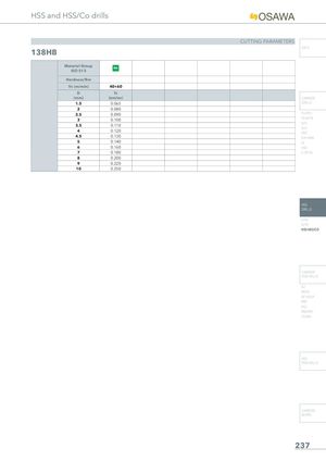 HSS and HSS/Co drills CUTTING PARAMETERS INFO 138HB Material GroupISO 513 N4 Hardness/Rm Vc (m/min) 40÷60 D fn (mm) (mm/rev) CARBIDE 1.5 0.065 DRILLS 2 0.080 2.5 0.090 PU-HPU 3 0.100 TA-4HTA 3.5 0.110 SUH ALH 4 0.120 HRC 4.5 0.130 SUH MINI 5 0.140 HL 6 0.160 HSD 7 0.180 C-SD-TA 8 0.200 9 0.220 10 0.250 HSS DRILLS LFTA SUTA HSS-HSS/CO CARBIDE END-MILLS G2 MDTA HF VH/UP MEF ALU MEX/MH UH/MH HSS END-MILLS CARBIDE BURRS 237