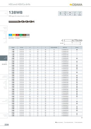 HSS and HSS/Co drills INFO 138WB DIN338 WB type for aluminium, short CARBIDE DRILLS PU-HPU TA-4HTA SUH P M K N S H ALH HRC H SUH MINI H 1st choice I suitable HL HSD C-SD-TA D(h8) D Tol. d l L PACKAGING EDP No. Stock 1.50 0/-0.014 1.5 18 40 10 P138WB0150 h 1.60 0/-0.014 1.6 20 43 10 P138WB0160 f 1.70 0/-0.014 1.7 20 43 10 P138WB0170 f 1.80 0/-0.014 1.8 22 46 10 P138WB0180 f 1.90 0/-0.014 1.9 22 46 10 P138WB0190 f HSS DRILLS 2.00 0/-0.014 2 24 49 10 P138WB0200 h 2.10 0/-0.014 2.1 24 49 10 P138WB0210 f LFTA 2.20 0/-0.014 2.2 27 53 10 P138WB0220 h SUTAHSS-HSS/CO2.30 0/-0.014 2.3 27 53 10 P138WB0230 f 2.40 0/-0.014 2.4 30 57 10 P138WB0240 h 2.50 0/-0.014 2.5 30 57 10 P138WB0250 h 2.60 0/-0.014 2.6 30 57 10 P138WB0260 h 2.70 0/-0.014 2.7 33 61 10 P138WB0270 f 2.80 0/-0.014 2.8 33 61 10 P138WB0280 h 2.90 0/-0.014 2.9 33 61 10 P138WB0290 f CARBIDE 3.00 0/-0.014 3 33 61 10 P138WB0300 h END-MILLS 3.10 0/-0.018 3.1 36 65 10 P138WB0310 h 3.20 0/-0.018 3.2 36 65 10 P138WB0320 h G2 3.30 0/-0.018 3.3 36 65 10 P138WB0330 h MDTA HF VH/UP 3.40 0/-0.018 3.4 39 70 10 P138WB0340 h MEF 3.50 0/-0.018 3.5 39 70 10 P138WB0350 h ALU 3.60 0/-0.018 3.6 39 70 10 P138WB0360 h MEX/MHUH/MH 3.70 0/-0.018 3.7 39 70 10 P138WB0370 h 3.80 0/-0.018 3.8 43 75 10 P138WB0380 h 3.90 0/-0.018 3.9 43 75 10 P138WB0390 h 4.00 0/-0.018 4 43 75 10 P138WB0400 h 4.10 0/-0.018 4.1 43 75 10 P138WB0410 h 4.20 0/-0.018 4.2 43 75 10 P138WB0420 h 4.30 0/-0.018 4.3 47 80 10 P138WB0430 f HSS 4.40 0/-0.018 4.4 47 80 10 P138WB0440 f END-MILLS 4.50 0/-0.018 4.5 47 80 10 P138WB0450 h 4.60 0/-0.018 4.6 47 80 10 P138WB0460 h 4.70 0/-0.018 4.7 47 80 10 P138WB0470 f 4.80 0/-0.018 4.8 52 86 10 P138WB0480 h 4.90 0/-0.018 4.9 52 86 10 P138WB0490 h 5.00 0/-0.018 5 52 86 10 P138WB0500 h 5.10 0/-0.018 5.1 52 86 10 P138WB0510 f 5.20 0/-0.018 5.2 52 86 10 P138WB0520 h CARBIDEBURRS 5.30 0/-0.018 5.3 52 86 10 P138WB0530 f h stock standard f non-standard stock m stock exhaustion 238