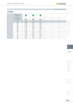 HSS and HSS/Co drills CUTTING PARAMETERS INFO 138WB Material GroupISO 513 N1 N2 N3 Hardness/Rm Vc (m/min) 40÷60 30÷50 25÷45 D fn fn fn (mm) (mm/rev) (mm/rev) (mm/rev) CARBIDE 1.5 0.070 0.063 0.060 DRILLS 2 0.080 0.072 0.068 2.5 0.090 0.081 0.077 PU-HPU 3 0.100 0.090 0.085 TA-4HTA 3.5 0.110 0.099 0.094 SUH ALH 4 0.120 0.108 0.102 HRC 4.5 0.130 0.117 0.111 SUH MINI 5 0.140 0.126 0.119 HL 6 0.160 0.144 0.136 HSD 7 0.180 0.162 0.153 C-SD-TA 8 0.200 0.180 0.170 9 0.220 0.198 0.187 10 0.250 0.225 0.213 HSS DRILLS LFTA SUTA HSS-HSS/CO CARBIDE END-MILLS G2 MDTA HF VH/UP MEF ALU MEX/MH UH/MH HSS END-MILLS CARBIDE BURRS 241