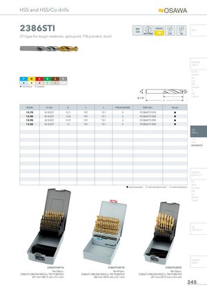 HSS and HSS/Co drills 2386STI DIN INFO 338 135° STI type for tough materials, split point, TiN pointed, short CARBIDE DRILLS PU-HPU TA-4HTA P M K N S H SUH ALH H H H I I HRC H 1st choice I suitable SUH MINI HL HSD C-SD-TA D(h8) D Tol. d l L PACKAGING EDP No. Stock 12.70 0/-0.027 12.7 101 151 5 P2386STI1270 h 12.80 0/-0.027 12.8 101 151 5 P2386STI1280 h 12.90 0/-0.027 12.9 101 151 5 P2386STI1290 h 13.00 0/-0.027 13 101 151 5 P2386STI1300 h HSS DRILLS LFTA SUTA HSS-HSS/CO CARBIDE END-MILLS G2 MDTA h stock standard f non-standard stock m stock exhaustion HF VH/UP MEF ALU MEX/MH UH/MH HSS END-MILLS CARBIDE BURRS 2386STIA01A 2386STIA01B 2386STIA05C Set 50pcs. Set 41pcs. Set 25pcs. 2386STI DIN338 HSS/Co TIN POINTED 2386STI DIN338 HSS/Co TIN POINTED 2386STI DIN338 HSS/Co TIN POINTED Ø1 mm÷Ø5.9 mm x 0.1 mm Ø6 mm÷Ø10 mm x 0.1 mm Ø1 mm÷Ø13 mm x 0.5 mm 245