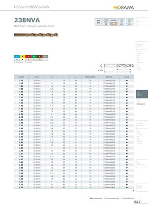 HSS and HSS/Co drills 238NVA DIN338 INFO NVA type for tough materials, short CARBIDE DRILLS PU-HPU TA-4HTA P M K N S H SUH ALH H H I I I HRC H 1st choice I suitable SUH MINI HL HSD C-SD-TA D(h8) D Tol. d l L PACKAGING EDP No. Stock 1.00 0/-0.014 1 12 34 10 P238NVA0100 h 1.10 0/-0.014 1.1 14 36 10 P238NVA0110 h 1.20 0/-0.014 1.2 16 38 10 P238NVA0120 h 1.25 0/-0.014 1.25 16 38 10 P238NVA0125 h 1.30 0/-0.014 1.3 16 38 10 P238NVA0130 h HSS 1.40 0/-0.014 1.4 18 40 10 P238NVA0140 h DRILLS 1.50 0/-0.014 1.5 18 40 10 P238NVA0150 h 1.60 0/-0.014 1.6 20 43 10 P238NVA0160 h LFTA 1.70 0/-0.014 1.7 20 43 10 P238NVA0170 h SUTAHSS-HSS/CO 1.75 0/-0.014 1.75 22 46 10 P238NVA0175 h 1.80 0/-0.014 1.8 22 46 10 P238NVA0180 h 1.90 0/-0.014 1.9 22 46 10 P238NVA0190 h 2.00 0/-0.014 2 24 49 10 P238NVA0200 h 2.10 0/-0.014 2.1 24 49 10 P238NVA0210 h 2.20 0/-0.014 2.2 27 53 10 P238NVA0220 h 2.25 0/-0.014 2.25 27 53 10 P238NVA0225 h CARBIDE 2.30 0/-0.014 2.3 27 53 10 P238NVA0230 h END-MILLS 2.40 0/-0.014 2.4 30 57 10 P238NVA0240 h 2.50 0/-0.014 2.5 30 57 10 P238NVA0250 h G2 MDTA 2.60 0/-0.014 2.6 30 57 10 P238NVA0260 h HF VH/UP 2.70 0/-0.014 2.7 33 61 10 P238NVA0270 h MEF 2.75 0/-0.014 2.75 33 61 10 P238NVA0275 h ALU 2.80 0/-0.014 2.8 33 61 10 P238NVA0280 h MEX/MHUH/MH 2.90 0/-0.014 2.9 33 61 10 P238NVA0290 h 3.00 0/-0.014 3 33 61 10 P238NVA0300 h 3.10 0/-0.018 3.1 36 65 10 P238NVA0310 h 3.20 0/-0.018 3.2 36 65 10 P238NVA0320 h 3.25 0/-0.018 3.25 36 65 10 P238NVA0325 h 3.30 0/-0.018 3.3 36 65 10 P238NVA0330 h 3.40 0/-0.018 3.4 39 70 10 P238NVA0340 h HSS 3.50 0/-0.018 3.5 39 70 10 P238NVA0350 h END-MILLS 3.60 0/-0.018 3.6 39 70 10 P238NVA0360 h 3.70 0/-0.018 3.7 39 70 10 P238NVA0370 h 3.75 0/-0.018 3.75 39 70 10 P238NVA0375 h 3.80 0/-0.018 3.8 43 75 10 P238NVA0380 h 3.90 0/-0.018 3.9 43 75 10 P238NVA0390 h 4.00 0/-0.018 4 43 75 10 P238NVA0400 h 4.10 0/-0.018 4.1 43 75 10 P238NVA0410 h 4.20 0/-0.018 4.2 43 75 10 P238NVA0420 h CARBIDEBURRS h stock standard f non-standard stock m stock exhaustion 247