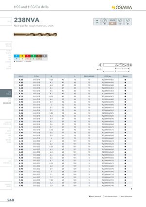 HSS and HSS/Co drills INFO 238NVA DIN338 NVA type for tough materials, short CARBIDE DRILLS PU-HPU TA-4HTA SUH P M K N S H ALH HRC H H I I I SUH MINI H 1st choice I suitable HL HSD C-SD-TA D(h8) D Tol. d l L PACKAGING EDP No. Stock 4.25 0/-0.018 4.25 43 75 10 P238NVA0425 h 4.30 0/-0.018 4.3 47 80 10 P238NVA0430 h 4.40 0/-0.018 4.4 47 80 10 P238NVA0440 h 4.50 0/-0.018 4.5 47 80 10 P238NVA0450 h 4.60 0/-0.018 4.6 47 80 10 P238NVA0460 h HSS DRILLS 4.70 0/-0.018 4.7 47 80 10 P238NVA0470 h 4.75 0/-0.018 4.75 47 80 10 P238NVA0475 h LFTA 4.80 0/-0.018 4.8 52 86 10 P238NVA0480 h SUTAHSS-HSS/CO4.90 0/-0.018 4.9 52 86 10 P238NVA0490 h 5.00 0/-0.018 5 52 86 10 P238NVA0500 h 5.10 0/-0.018 5.1 52 86 10 P238NVA0510 h 5.20 0/-0.018 5.2 52 86 10 P238NVA0520 h 5.25 0/-0.018 5.25 52 86 10 P238NVA0525 h 5.30 0/-0.018 5.3 52 86 10 P238NVA0530 h 5.40 0/-0.018 5.4 57 93 10 P238NVA0540 h CARBIDE 5.50 0/-0.018 5.5 57 93 10 P238NVA0550 h END-MILLS 5.60 0/-0.018 5.6 57 93 10 P238NVA0560 h 5.70 0/-0.018 5.7 57 93 10 P238NVA0570 h G2 5.75 0/-0.018 5.75 57 93 10 P238NVA0575 h MDTA HF VH/UP 5.80 0/-0.018 5.8 57 93 10 P238NVA0580 h MEF 5.90 0/-0.018 5.9 57 93 10 P238NVA0590 h ALU 6.00 0/-0.018 6 57 93 10 P238NVA0600 h MEX/MHUH/MH 6.10 0/-0.022 6.1 63 101 10 P238NVA0610 h 6.20 0/-0.022 6.2 63 101 10 P238NVA0620 h 6.25 0/-0.022 6.25 63 101 10 P238NVA0625 h 6.30 0/-0.022 6.3 63 101 10 P238NVA0630 h 6.40 0/-0.022 6.4 63 101 10 P238NVA0640 h 6.50 0/-0.022 6.5 63 101 10 P238NVA0650 h 6.60 0/-0.022 6.6 63 101 5 P238NVA0660 h HSS 6.70 0/-0.022 6.7 63 101 5 P238NVA0670 h END-MILLS 6.75 0/-0.022 6.75 69 109 5 P238NVA0675 h 6.80 0/-0.022 6.8 69 109 5 P238NVA0680 h 6.90 0/-0.022 6.9 69 109 5 P238NVA0690 h 7.00 0/-0.022 7 69 109 5 P238NVA0700 h 7.10 0/-0.022 7.1 69 109 5 P238NVA0710 h 7.20 0/-0.022 7.2 69 109 5 P238NVA0720 h 7.25 0/-0.022 7.25 69 109 5 P238NVA0725 h 7.30 0/-0.022 7.3 69 109 5 P238NVA0730 h CARBIDEBURRS 7.40 0/-0.022 7.4 69 109 5 P238NVA0740 h h stock standard f non-standard stock m stock exhaustion 248