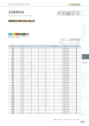 HSS and HSS/Co drills 238NVA DIN338 INFO NVA type for tough materials, short CARBIDE DRILLS PU-HPU TA-4HTA P M K N S H SUH ALH H H I I I HRC H 1st choice I suitable SUH MINI HL HSD C-SD-TA D(h8) D Tol. d l L PACKAGING EDP No. Stock 7.50 0/-0.022 7.5 69 109 5 P238NVA0750 h 7.60 0/-0.022 7.6 75 117 5 P238NVA0760 h 7.70 0/-0.022 7.7 75 117 5 P238NVA0770 h 7.75 0/-0.022 7.75 75 117 5 P238NVA0775 h 7.80 0/-0.022 7.8 75 117 5 P238NVA0780 h HSS 7.90 0/-0.022 7.9 75 117 5 P238NVA0790 h DRILLS 8.00 0/-0.022 8 75 117 5 P238NVA0800 h 8.10 0/-0.022 8.1 75 117 5 P238NVA0810 h LFTA 8.20 0/-0.022 8.2 75 117 5 P238NVA0820 h SUTAHSS-HSS/CO 8.25 0/-0.022 8.25 75 117 5 P238NVA0825 h 8.30 0/-0.022 8.3 75 117 5 P238NVA0830 h 8.40 0/-0.022 8.4 75 117 5 P238NVA0840 h 8.50 0/-0.022 8.5 75 117 5 P238NVA0850 h 8.60 0/-0.022 8.6 81 125 5 P238NVA0860 h 8.70 0/-0.022 8.7 81 125 5 P238NVA0870 h 8.75 0/-0.022 8.75 81 125 5 P238NVA0875 h CARBIDE 8.80 0/-0.022 8.8 81 125 5 P238NVA0880 h END-MILLS 8.90 0/-0.022 8.9 81 125 5 P238NVA0890 h 9.00 0/-0.022 9 81 125 5 P238NVA0900 h G2 MDTA 9.10 0/-0.022 9.1 81 125 5 P238NVA0910 h HF VH/UP 9.20 0/-0.022 9.2 81 125 5 P238NVA0920 h MEF 9.25 0/-0.022 9.25 81 125 5 P238NVA0925 h ALU 9.30 0/-0.022 9.3 81 125 5 P238NVA0930 h MEX/MHUH/MH 9.40 0/-0.022 9.4 81 125 5 P238NVA0940 h 9.50 0/-0.022 9.5 81 125 5 P238NVA0950 h 9.60 0/-0.022 9.6 87 133 5 P238NVA0960 h 9.70 0/-0.022 9.7 87 133 5 P238NVA0970 h 9.75 0/-0.022 9.75 87 133 5 P238NVA0975 h 9.80 0/-0.022 9.8 87 133 5 P238NVA0980 h 9.90 0/-0.022 9.9 87 133 5 P238NVA0990 h HSS 10.00 0/-0.022 10 87 133 5 P238NVA1000 h END-MILLS 10.20 0/-0.027 10.2 87 133 5 P238NVA1020 h 10.50 0/-0.027 10.5 87 133 5 P238NVA1050 h 11.00 0/-0.027 11 94 142 5 P238NVA1100 h 11.50 0/-0.027 11.5 94 142 5 P238NVA1150 h 12.00 0/-0.027 12 101 151 5 P238NVA1200 h 12.50 0/-0.027 12.5 101 151 5 P238NVA1250 h 13.00 0/-0.027 13 101 151 5 P238NVA1300 h 13.50 0/-0.027 13.5 108 160 1 P238NVA1350 h CARBIDEBURRS h stock standard f non-standard stock m stock exhaustion 249