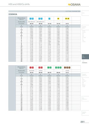 HSS and HSS/Co drills CUTTING PARAMETERS INFO 238NVA Material Group P1 P2 P3 P4 P7ISO 513 M1 M2 M3 Hardness/Rm 500÷700 N/mm² 600÷1000 N/mm² Vc (m/min) 25÷35 20÷30 12÷18 12÷18 8÷12 D fn fn fn fn fn (mm) (mm/rev) (mm/rev) (mm/rev) (mm/rev) (mm/rev) CARBIDE 1 0.017 0.014 0.012 0.012 0.009 DRILLS 1.5 0.035 0.030 0.025 0.025 0.018 2 0.050 0.043 0.035 0.035 0.025 PU-HPU 2.5 0.060 0.051 0.042 0.042 0.030 TA-4HTA 3 0.070 0.060 0.049 0.049 0.035 SUH ALH 3.5 0.080 0.068 0.056 0.056 0.040 HRC 4 0.090 0.077 0.063 0.063 0.045 SUH MINI 5 0.100 0.085 0.070 0.070 0.050 HL 6 0.110 0.094 0.077 0.077 0.055 HSD 7 0.120 0.102 0.084 0.084 0.060 C-SD-TA 8 0.130 0.111 0.091 0.091 0.065 9 0.140 0.119 0.098 0.098 0.070 10 0.160 0.136 0.112 0.112 0.080 11 0.170 0.145 0.119 0.119 0.085 12 0.180 0.153 0.126 0.126 0.090 13 0.190 0.162 0.133 0.133 0.095 14 0.200 0.170 0.140 0.140 0.100 15 0.210 0.179 0.147 0.147 0.105 16 0.220 0.187 0.154 0.154 0.110 17 0.230 0.196 0.161 0.161 0.115 HSSDRILLS 18 0.240 0.204 0.168 0.168 0.120 19 0.250 0.213 0.175 0.175 0.125 LFTA 20 0.260 0.221 0.182 0.182 0.130 SUTA HSS-HSS/CO Material Group K1 K2 K3 K4 N1 N5 N2 N3 N4 S1 S2 S4 ISO 513 Hardness/Rm 150÷350 HB <350 HB <35 HRC Vc (m/min) 25÷35 20÷30 50÷70 40÷60 8÷12 D fn fn fn fn fn CARBIDE (mm) (mm/rev) (mm/rev) (mm/rev) (mm/rev) (mm/rev) END-MILLS 1 0.019 0.013 0.024 0.017 0.007 1.5 0.039 0.026 0.049 0.035 0.014 G2 2 0.055 0.038 0.070 0.050 0.020 MDTA 2.5 0.066 0.045 0.084 0.060 0.024 HF VH/UP 3 0.077 0.053 0.098 0.070 0.028 MEFALU 3.5 0.088 0.060 0.112 0.080 0.032 MEX/MH 4 0.099 0.068 0.126 0.090 0.036 UH/MH 5 0.110 0.075 0.140 0.100 0.040 6 0.121 0.083 0.154 0.110 0.044 7 0.132 0.090 0.168 0.120 0.048 8 0.143 0.098 0.182 0.130 0.052 9 0.154 0.105 0.196 0.140 0.056 10 0.176 0.120 0.224 0.160 0.064 11 0.187 0.128 0.238 0.170 0.068 12 0.198 0.135 0.252 0.180 0.072 HSS 13 0.209 0.143 0.266 0.190 0.076 END-MILLS 14 0.220 0.150 0.280 0.200 0.080 15 0.231 0.158 0.294 0.210 0.084 16 0.242 0.165 0.308 0.220 0.088 17 0.253 0.173 0.322 0.230 0.092 18 0.264 0.180 0.336 0.240 0.096 19 0.275 0.188 0.350 0.250 0.100 20 0.286 0.195 0.364 0.260 0.104 CARBIDE BURRS 251