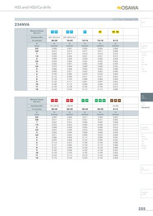 HSS and HSS/Co drills CUTTING PARAMETERS INFO 234NVA Material Group P1 P2 P3 P4 P7ISO 513 M1 M2 M3 Hardness/Rm 500÷700 N/mm² 600÷1000 N/mm² Vc (m/min) 20÷30 15÷25 12÷16 12÷16 8÷12 D fn fn fn fn fn (mm) (mm/rev) (mm/rev) (mm/rev) (mm/rev) (mm/rev) CARBIDE 0.5 0.008 0.007 0.006 0.006 0.004 DRILLS 0.8 0.015 0.013 0.011 0.011 0.008 1 0.020 0.017 0.014 0.014 0.010 PU-HPU 1.5 0.030 0.026 0.021 0.021 0.015 TA-4HTA 2 0.040 0.034 0.028 0.028 0.020 SUH ALH 2.5 0.050 0.043 0.035 0.035 0.025 HRC 3 0.060 0.051 0.042 0.042 0.030 SUH MINI 3.5 0.070 0.060 0.049 0.049 0.035 HL 4 0.080 0.068 0.056 0.056 0.040 HSD 5 0.090 0.077 0.063 0.063 0.045 C-SD-TA 6 0.100 0.085 0.070 0.070 0.050 7 0.110 0.094 0.077 0.077 0.055 8 0.120 0.102 0.084 0.084 0.060 9 0.130 0.111 0.091 0.091 0.065 10 0.140 0.119 0.098 0.098 0.070 11 0.150 0.128 0.105 0.105 0.075 12 0.160 0.136 0.112 0.112 0.080 HSS DRILLS Material Group K1 K2 K3 K4 N1 N5 N2 N3 N4 S1 S2 S4 ISO 513 LFTA Hardness/Rm 150÷350 HB <350 HB <35 HRC SUTA HSS-HSS/CO Vc (m/min) 20÷30 20÷30 40÷60 30÷50 8÷12 D fn fn fn fn fn (mm) (mm/rev) (mm/rev) (mm/rev) (mm/rev) (mm/rev) 0.5 0.009 0.006 0.011 0.008 0.003 0.8 0.017 0.011 0.021 0.015 0.006 1 0.022 0.015 0.028 0.020 0.008 1.5 0.033 0.023 0.042 0.030 0.012 2 0.044 0.030 0.056 0.040 0.016 CARBIDE 2.5 0.055 0.038 0.070 0.050 0.020 END-MILLS 3 0.066 0.045 0.084 0.060 0.024 3.5 0.077 0.053 0.098 0.070 0.028 G2 4 0.088 0.060 0.112 0.080 0.032 MDTA 5 0.099 0.068 0.126 0.090 0.036 HF VH/UP 6 0.110 0.075 0.140 0.100 0.040 MEFALU 7 0.121 0.083 0.154 0.110 0.044 MEX/MH 8 0.132 0.090 0.168 0.120 0.048 UH/MH 9 0.143 0.098 0.182 0.130 0.052 10 0.154 0.105 0.196 0.140 0.056 11 0.165 0.113 0.210 0.150 0.060 12 0.176 0.120 0.224 0.160 0.064 HSS END-MILLS CARBIDE BURRS 255