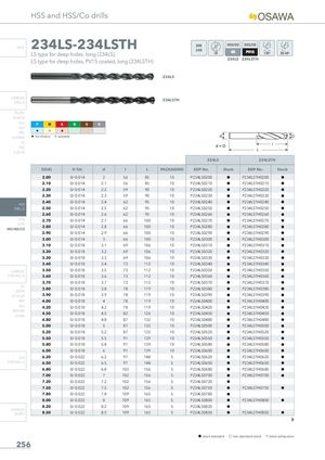 HSS and HSS/Co drills INFO 234LS-234LSTH DIN340 LS type for deep holes, long (234LS), LS type for deep holes, PV15 coated, long (234LSTH) 234LS 234LSTH 234LS CARBIDEDRILLS 234LSTH PU-HPU TA-4HTA SUH P M K N S H ALH HRC H I H SUH MINI H 1st choice I suitable HL HSD C-SD-TA 234LS 234LSTH D(h8) D Tol. d l L PACKAGING EDP No. Stock EDP No. Stock 2.00 0/-0.014 2 56 85 10 P234LS0200 h P234LSTH0200 h 2.10 0/-0.014 2.1 56 85 10 P234LS0210 h P234LSTH0210 h 2.20 0/-0.014 2.2 59 90 10 P234LS0220 h P234LSTH0220 h 2.30 0/-0.014 2.3 59 90 10 P234LS0230 h P234LSTH0230 h 2.40 0/-0.014 2.4 62 95 10 P234LS0240 h P234LSTH0240 h HSS DRILLS 2.50 0/-0.014 2.5 62 95 10 P234LS0250 h P234LSTH0250 h 2.60 0/-0.014 2.6 62 95 10 P234LS0260 h P234LSTH0260 h LFTA 2.70 0/-0.014 2.7 66 100 10 P234LS0270 h P234LSTH0270 h SUTAHSS-HSS/CO2.80 0/-0.014 2.8 66 100 10 P234LS0280 h P234LSTH0280 h 2.90 0/-0.014 2.9 66 100 10 P234LS0290 h P234LSTH0290 h 3.00 0/-0.014 3 66 100 10 P234LS0300 h P234LSTH0300 h 3.10 0/-0.018 3.1 69 106 10 P234LS0310 h P234LSTH0310 h 3.20 0/-0.018 3.2 69 106 10 P234LS0320 h P234LSTH0320 h 3.30 0/-0.018 3.3 69 106 10 P234LS0330 h P234LSTH0330 h 3.40 0/-0.018 3.4 73 112 10 P234LS0340 h P234LSTH0340 h CARBIDE 3.50 0/-0.018 3.5 73 112 10 P234LS0350 h P234LSTH0350 h END-MILLS 3.60 0/-0.018 3.6 73 112 10 P234LS0360 h P234LSTH0360 h 3.70 0/-0.018 3.7 73 112 10 P234LS0370 h P234LSTH0370 h G2 3.80 0/-0.018 3.8 78 119 10 P234LS0380 h P234LSTH0380 h MDTA HF VH/UP 3.90 0/-0.018 3.9 78 119 10 P234LS0390 h P234LSTH0390 h MEF 4.00 0/-0.018 4 78 119 10 P234LS0400 h P234LSTH0400 h ALU 4.20 0/-0.018 4.2 78 119 10 P234LS0420 h P234LSTH0420 h MEX/MHUH/MH 4.50 0/-0.018 4.5 82 126 10 P234LS0450 h P234LSTH0450 h 4.80 0/-0.018 4.8 87 132 10 P234LS0480 h P234LSTH0480 h 5.00 0/-0.018 5 87 132 10 P234LS0500 h P234LSTH0500 h 5.20 0/-0.018 5.2 87 132 10 P234LS0520 h P234LSTH0520 h 5.50 0/-0.018 5.5 91 139 10 P234LS0550 h P234LSTH0550 h 5.80 0/-0.018 5.8 91 139 10 P234LS0580 h P234LSTH0580 h 6.00 0/-0.018 6 91 139 10 P234LS0600 h P234LSTH0600 h HSS 6.20 0/-0.022 6.2 97 148 5 P234LS0620 h P234LSTH0620 h END-MILLS 6.50 0/-0.022 6.5 97 148 5 P234LS0650 h P234LSTH0650 h 6.80 0/-0.022 6.8 102 156 5 P234LS0680 h P234LSTH0680 h 7.00 0/-0.022 7 102 156 5 P234LS0700 h P234LSTH0700 h 7.20 0/-0.022 7.2 102 156 5 P234LS0720 h 7.50 0/-0.022 7.5 102 156 5 P234LS0750 h P234LSTH0750 h 7.80 0/-0.022 7.8 109 165 5 P234LS0780 h 8.00 0/-0.022 8 109 165 5 P234LS0800 h P234LSTH0800 h 8.20 0/-0.022 8.2 109 165 5 P234LS0820 h CARBIDEBURRS 8.50 0/-0.022 8.5 109 165 5 P234LS0850 h P234LSTH0850 h h stock standard f non-standard stock m stock exhaustion 256