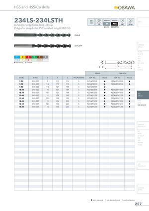 HSS and HSS/Co drills 234LS-234LSTH DIN340 INFO LS type for deep holes, long (234LS), LS type for deep holes, PV15 coated, long (234LSTH) 234LS 234LSTH 234LS 234LSTH CARBIDEDRILLS PU-HPU TA-4HTA P M K N S H SUH ALH H I H HRC H 1st choice I suitable SUH MINI HL HSD C-SD-TA 234LS 234LSTH D(h8) D Tol. d l L PACKAGING EDP No. Stock EDP No. Stock 9.00 0/-0.022 9 115 175 5 P234LS0900 h P234LSTH0900 h 9.50 0/-0.022 9.5 115 175 5 P234LS0950 h P234LSTH0950 h 9.80 0/-0.022 9.8 121 184 5 P234LS0980 h 10.00 0/-0.022 10 121 184 5 P234LS1000 h P234LSTH1000 h 10.50 0/-0.027 10.5 121 184 5 P234LS1050 h P234LSTH1050 h HSS 11.00 0/-0.027 11 128 195 5 P234LS1100 h P234LSTH1100 h DRILLS 11.50 0/-0.027 11.5 128 195 5 P234LS1150 h P234LSTH1150 h 12.00 0/-0.027 12 134 205 5 P234LS1200 h P234LSTH1200 h LFTA 12.50 0/-0.027 12.5 134 205 5 P234LS1250 h P234LSTH1250 h SUTAHSS-HSS/CO 13.00 0/-0.027 13 134 205 5 P234LS1300 h P234LSTH1300 h CARBIDE END-MILLS G2 MDTA HF VH/UP MEF ALU MEX/MH UH/MH HSS END-MILLS CARBIDE BURRS h stock standard f non-standard stock m stock exhaustion 257
