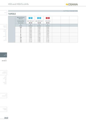 HSS and HSS/Co drills CUTTING PARAMETERS INFO 1692LS Material Group P1 P2ISO 513 P3 P4 K1 K2 Hardness/Rm 500÷700 N/mm² 600÷1000 N/mm² 150÷350 HB Vc (m/min) 20÷24 16÷20 20÷24 D fn fn fn CARBIDE (mm) (mm/rev) (mm/rev) (mm/rev) DRILLS 3.5 0.045 0.038 0.050 4 0.053 0.045 0.058 PU-HPU 5 0.060 0.051 0.066 TA-4HTA 6 0.068 0.057 0.074 SUH 7 0.075 0.064 0.083 ALH HRC 8 0.083 0.070 0.091 SUH MINI 9 0.090 0.077 0.099 HL 10 0.098 0.083 0.107 HSD 11 0.105 0.089 0.116 C-SD-TA 12 0.113 0.096 0.124 13 0.120 0.102 0.132 HSS DRILLS LFTA SUTA HSS-HSS/CO CARBIDE END-MILLS G2 MDTA HF VH/UP MEF ALU MEX/MH UH/MH HSS END-MILLS CARBIDE BURRS 262