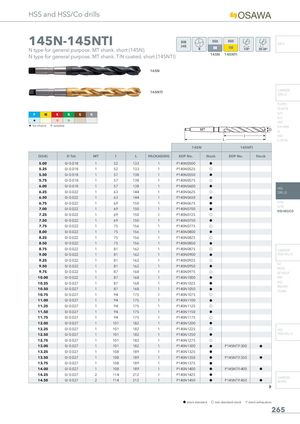 HSS and HSS/Co drills 145N-145NTI DIN345 INFO N type for general purpose. MT shank. short (145N). N type for general purpose. MT shank. TiN coated. short (145NTI) 145N 145NTI 145N 145NTI CARBIDEDRILLS PU-HPU TA-4HTA P M K N S H SUH ALH H I I HRC H 1st choice I suitable SUH MINI HL HSD C-SD-TA 145N 145NTI D(h8) D Tol. MT l L PACKAGING EDP No. Stock EDP No. Stock 5.00 0/-0.018 1 52 133 1 P145N0500 h 5.25 0/-0.018 1 52 133 1 P145N0525 f 5.50 0/-0.018 1 57 138 1 P145N0550 h 5.75 0/-0.018 1 57 138 1 P145N0575 f 6.00 0/-0.018 1 57 138 1 P145N0600 h HSS 6.25 0/-0.022 1 63 144 1 P145N0625 f DRILLS 6.50 0/-0.022 1 63 144 1 P145N0650 h 6.75 0/-0.022 1 69 150 1 P145N0675 h LFTA 7.00 0/-0.022 1 69 150 1 P145N0700 h SUTAHSS-HSS/CO 7.25 0/-0.022 1 69 150 1 P145N0725 f 7.50 0/-0.022 1 69 150 1 P145N0750 h 7.75 0/-0.022 1 75 156 1 P145N0775 f 8.00 0/-0.022 1 75 156 1 P145N0800 h 8.25 0/-0.022 1 75 156 1 P145N0825 f 8.50 0/-0.022 1 75 156 1 P145N0850 h 8.75 0/-0.022 1 81 162 1 P145N0875 f CARBIDE 9.00 0/-0.022 1 81 162 1 P145N0900 h END-MILLS 9.25 0/-0.022 1 81 162 1 P145N0925 f 9.50 0/-0.022 1 81 162 1 P145N0950 h G2 MDTA 9.75 0/-0.022 1 87 168 1 P145N0975 f HF VH/UP 10.00 0/-0.022 1 87 168 1 P145N1000 h MEF 10.25 0/-0.027 1 87 168 1 P145N1025 h ALU 10.50 0/-0.027 1 87 168 1 P145N1050 h MEX/MHUH/MH 10.75 0/-0.027 1 94 175 1 P145N1075 f 11.00 0/-0.027 1 94 175 1 P145N1100 h 11.25 0/-0.027 1 94 175 1 P145N1125 f 11.50 0/-0.027 1 94 175 1 P145N1150 h 11.75 0/-0.027 1 94 175 1 P145N1175 f 12.00 0/-0.027 1 101 182 1 P145N1200 h 12.25 0/-0.027 1 101 182 1 P145N1225 f HSS 12.50 0/-0.027 1 101 182 1 P145N1250 h END-MILLS 12.75 0/-0.027 1 101 182 1 P145N1275 f 13.00 0/-0.027 1 101 182 1 P145N1300 h P145NTI1300 h 13.25 0/-0.027 1 108 189 1 P145N1325 h 13.50 0/-0.027 1 108 189 1 P145N1350 h P145NTI1350 h 13.75 0/-0.027 1 108 189 1 P145N1375 h 14.00 0/-0.027 1 108 189 1 P145N1400 h P145NTI1400 h 14.25 0/-0.027 2 114 212 1 P145N1425 h 14.50 0/-0.027 2 114 212 1 P145N1450 h P145NTI1450 h CARBIDEBURRS h stock standard f non-standard stock m stock exhaustion 265