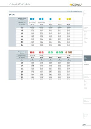 HSS and HSS/Co drills CUTTING PARAMETERS INFO 245N Material Group P1 P2 P3 P4 P7ISO 513 M1 M2 M3 Hardness/Rm 500÷700 N/mm² 600÷1000 N/mm² Vc (m/min) 25÷35 20÷30 12÷18 12÷18 8÷12 D fn fn fn fn fn (mm) (mm/rev) (mm/rev) (mm/rev) (mm/rev) (mm/rev) CARBIDE 13 0.224 0.190 0.157 0.157 0.112 DRILLS 14 0.232 0.197 0.162 0.162 0.116 15 0.240 0.204 0.168 0.168 0.120 PU-HPU 16 0.250 0.213 0.175 0.175 0.125 TA-4HTA 17 0.265 0.225 0.186 0.186 0.133 SUH ALH 18 0.280 0.238 0.196 0.196 0.140 HRC 19 0.295 0.251 0.207 0.207 0.148 SUH MINI 20 0.315 0.268 0.221 0.221 0.158 HL 22 0.330 0.281 0.231 0.231 0.165 HSD 25 0.350 0.298 0.245 0.245 0.175 C-SD-TA 27 0.370 0.315 0.259 0.259 0.185 30 0.400 0.340 0.280 0.280 0.200 Material Group K1 K2ISO 513 K3 K4 N1 N5 N2 N3 N4 S1 S2 S4 Hardness/Rm 150÷350 HB <350 HB <35 HRC Vc (m/min) 25÷35 20÷30 50÷70 40÷60 8÷12 HSS DRILLS D fn fn fn fn fn (mm) (mm/rev) (mm/rev) (mm/rev) (mm/rev) (mm/rev) LFTA 13 0.246 0.168 0.314 0.224 0.090 SUTA 14 0.255 0.174 0.325 0.232 0.093 HSS-HSS/CO 15 0.264 0.180 0.336 0.240 0.096 16 0.275 0.188 0.350 0.250 0.100 17 0.292 0.199 0.371 0.265 0.106 18 0.308 0.210 0.392 0.280 0.112 19 0.325 0.221 0.413 0.295 0.118 20 0.347 0.236 0.441 0.315 0.126 22 0.363 0.248 0.462 0.330 0.132 25 0.385 0.263 0.490 0.350 0.140 CARBIDE 27 0.407 0.278 0.518 0.370 0.148 END-MILLS 30 0.440 0.300 0.560 0.400 0.160 G2 MDTA HF VH/UP MEF ALU MEX/MH UH/MH HSS END-MILLS CARBIDE BURRS 271