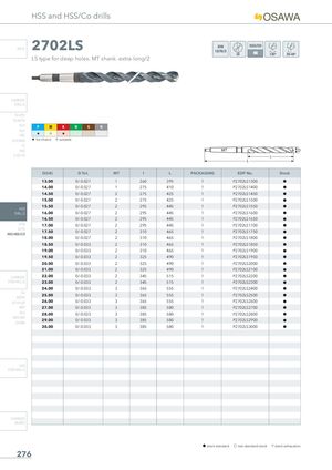 HSS and HSS/Co drills INFO 2702LS DIN1870/2 LS type for deep holes. MT shank. extra-long/2 CARBIDE DRILLS PU-HPU TA-4HTA SUH P M K N S H ALH HRC H I H SUH MINI H 1st choice I suitable HL HSD C-SD-TA D(h8) D Tol. MT l L PACKAGING EDP No. Stock 13.00 0/-0.027 1 260 395 1 P2702LS1300 h 14.00 0/-0.027 1 275 410 1 P2702LS1400 h 14.50 0/-0.027 2 275 425 1 P2702LS1450 h 15.00 0/-0.027 2 275 425 1 P2702LS1500 h 15.50 0/-0.027 2 295 445 1 P2702LS1550 h HSS DRILLS 16.00 0/-0.027 2 295 445 1 P2702LS1600 h 16.50 0/-0.027 2 295 445 1 P2702LS1650 h LFTA 17.00 0/-0.027 2 295 445 1 P2702LS1700 h SUTAHSS-HSS/CO17.50 0/-0.027 2 310 465 1 P2702LS1750 h 18.00 0/-0.027 2 310 465 1 P2702LS1800 h 18.50 0/-0.033 2 310 465 1 P2702LS1850 h 19.00 0/-0.033 2 310 465 1 P2702LS1900 h 19.50 0/-0.033 2 325 490 1 P2702LS1950 h 20.00 0/-0.033 2 325 490 1 P2702LS2000 h 21.00 0/-0.033 2 325 490 1 P2702LS2100 h CARBIDE 22.00 0/-0.033 2 345 515 1 P2702LS2200 h END-MILLS 23.00 0/-0.033 2 345 515 1 P2702LS2300 h 24.00 0/-0.033 3 365 555 1 P2702LS2400 h G2 25.00 0/-0.033 3 365 555 1 P2702LS2500 h MDTA HF VH/UP 26.00 0/-0.033 3 365 555 1 P2702LS2600 h MEF 27.00 0/-0.033 3 385 580 1 P2702LS2700 h ALU 28.00 0/-0.033 3 385 580 1 P2702LS2800 h MEX/MHUH/MH 29.00 0/-0.033 3 385 580 1 P2702LS2900 h 30.00 0/-0.033 3 385 580 1 P2702LS3000 h HSS END-MILLS CARBIDE BURRS h stock standard f non-standard stock m stock exhaustion 276