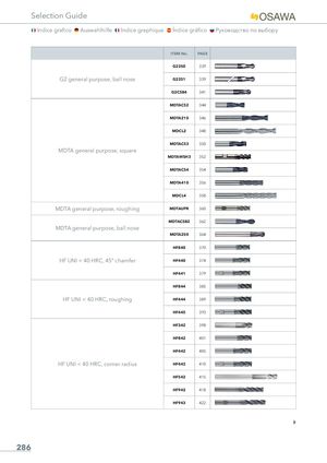 Selection Guide Indice grafico Auswahlhilfe Indice graphique Índice gráfico Руководство по выбору ITEM No. PAGE G2250 339 G2 general purpose, ball nose G2251 339 G2CSB4 341 MDTACS2 344 MDTA210 346 MDCL2 348 MDTACS3 350 MDTA general purpose, square MDTAWSH3 352 MDTACS4 354 MDTA410 356 MDCL4 358 MDTA general purpose, roughing MDTAUPR 360 MDTACSB2 362 MDTA general purpose, ball nose MDTA250 364 HF840 370 HF UNI < 40 HRC, 45° chamfer HF440 374 HF441 379 HF844 385 HF UNI < 40 HRC, roughing HF444 389 HF445 393 HF342 398 HF842 401 HF442 405 HF UNI < 40 HRC, corner radius HF443 410 HF542 415 HF942 418 HF943 422 286