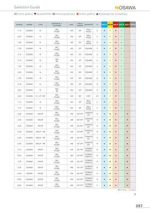 Selection Guide Indice grafico Auswahlhilfe Indice graphique Índice gráfico Руководство по выбору RANGE NORM TYPE MATERIAL /COATING HRC HELIXANGLEGEOMETRY Z ISO P ISO M ISO K ISO N ISO S ISO H 1-12 OSAWA N MGPV200 <45 30° BALLNOSE 2 H I H I 6-20 OSAWA N MGPV200 <45 30° BALLNOSE 2 H I H I 1-20 OSAWA N MGPV200 <45 30° BALLNOSE 4 H I H I 1-20 OSAWA N MGPV200 <45 30° SQUARE 2 H I H I 3-12 OSAWA N MGPV200 <45 30° SQUARE 2 H I H I 3-12 OSAWA N MGBR <45 30° SQUARE 2 H I H I 1-20 OSAWA N MGPV200 <45 30° SQUARE 3 H I H I 3-20 OSAWA N MGPV200 <45 45° SQUARE 3 H I H I 1-20 OSAWA N MGPV200 <45 30° SQUARE 4 H I H I 3-16 OSAWA N MGPV200 <45 30° SQUARE 4 H I H I 3-20 OSAWA N MGBR <45 30° SQUARE 4 H I H I 6-20 OSAWA N – UP – NR MGPV200 <45 40° C45° 3-4 H I H 1-12 OSAWA N MGPV200 <45 30° BALLNOSE 2 H I H I 3-12 OSAWA N MGPV200 <45 30° BALLNOSE 2 H I H I 3-20 OSAWA VH/UP MGPV300 <40 36°/39° CHAMFER45° 4 H H H H 3-20 OSAWA VH/UP MGPV300 <40 36°/39° CHAMFER45° 4 H H H H 3-20 OSAWA VH/UP MGPV300 <40 36°/39° CHAMFER45° 4 H H H H 6-20 OSAWA VH/UP – HR MGPV300 <40 36°/39° CHAMFER45° 4 H H H H 6-20 OSAWA VH/UP – HR MGPV300 <40 36°/39° CHAMFER45° 4 H H H H 6-20 OSAWA VH/UP – HR MGPV300 <40 36°/39° CHAMFER45° 4 H H H H 3-12 OSAWA VH/UP MGPV300 <40 36°/39° CORNERRADIUS 4 H H H H 4-20 OSAWA VH/UP MGPV300 <40 36°/39° CORNERRADIUS 4 H H H H 3-20 OSAWA VH/UP MGPV300 <40 36°/39° CORNERRADIUS 4 H H H H 3-20 OSAWA VH/UP MGPV300 <40 36°/39° CORNERRADIUS 4 H H H H 6-20 OSAWA VH/UP MGPV300 <40 36°/39° CORNERRADIUS 4 H H H H 4-20 OSAWA VH/UP MGPV300 <40 36°/39° CORNERRADIUS 4 H H H H 4-20 OSAWA VH/UP MGPV300 <40 36°/39° CORNERRADIUS 4 H H H H H 1st choice I suitable 287