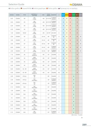 Selection Guide Indice grafico Auswahlhilfe Indice graphique Índice gráfico Руководство по выбору RANGE NORM TYPE MATERIAL /COATING HRC HELIXANGLEGEOMETRY Z ISO P ISO M ISO K ISO N ISO S ISO H 4-20 OSAWA VH MGPV300 <40 36°/37°/38° CORNERRADIUS 5 H H H H 4-20 OSAWA VH MGPV300 <40 36°/37°/38° CORNERRADIUS 5 H H H H 6-20 OSAWA VH MGPV300 <40 36°/37°/38° CORNERRADIUS 5 H H H H 6-20 OSAWA VH MGPV300 <40 36°/37°/38° CORNERRADIUS 5 H H H H 1-20 OSAWA VH/UP MGPV300 <40 36°/39° CR+C45° 4 H H H H 3-20 OSAWA UP MGPV300 35÷55 40° CHAMFER45° 4 H H H H H 3-20 OSAWA UP MGPV300 35÷55 40° CHAMFER45° 4 H H H H H 3-20 OSAWA UP MGPV300 35÷55 40° CHAMFER45° 4 H H H H H 4-20 OSAWA UP MGPV300 35÷55 40° CORNERRADIUS 4 H H H H H 3-20 OSAWA UP MGPV300 35÷55 40° CORNERRADIUS 4 H H H H H 1-16 OSAWA VA UMGENDLESS <45 35° SQUARE 2 H H H 6-20 OSAWA VA UMGENDLESS <45 50° SQUARE 3 H H H 2-20 OSAWA VA UMGENDLESS <45 35° SQUARE 4 H H H 6-20 OSAWA VA UMGENDLESS <45 50° SQUARE 6-8 H H H 4-20 OSAWA VA - HR UMGENDLESS <45 45° SQUARE 3-6 H H H 6-20 OSAWA VA - HR UMGENDLESS <45 45° SQUARE 4-6 H H H 3-20 OSAWA UP ALU MGBR 40° SQUARE 4 H 2-20 OSAWA UP ALU MGPOLISHED 30° CORNERRADIUS 3 H 3-20 OSAWA UP ALU MGBR 30° CORNERRADIUS 3 H 2-12 OSAWA ALU MGPOLISHED 25° SQUARE 1 H 1-20 OSAWA ALU MGPOLISHED 45° SQUARE 2 H 1-20 OSAWA ALU MGPOLISHED 55° SQUARE 3 H 3-6 OSAWA ALU MGPOLISHED 55° SQUARE 3 H 3-12 OSAWA ALU MGPOLISHED 55° SQUARE 3 H 8-20 OSAWA ALU MGPOLISHED 55° SQUARE 3 H 6-12 OSAWA ALU MGPOLISHED 50° SQUARE 6 H 2-12 OSAWA ALU MGPV200 25° CORNERRADIUS 2 H H 1st choice I suitable 289