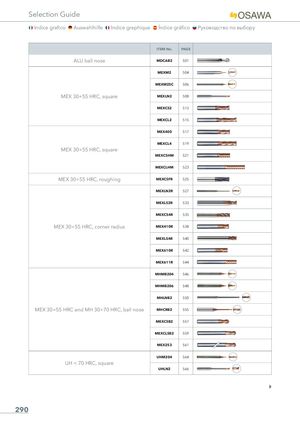 Selection Guide Indice grafico Auswahlhilfe Indice graphique Índice gráfico Руководство по выбору ITEM No. PAGE ALU ball nose MDCAB2 501 MEXM2 504 MEXM2SC 506 MEX 30÷55 HRC, square MEXLN2 508 MEXCS2 513 MEXCL2 515 MEX400 517 MEXCL4 519 MEX 30÷55 HRC, square MEXCSHM 521 MEXCLHM 523 MEX 30÷55 HRC, roughing MEXCSFR 525 MEXLN2R 527 MEXLS2R 533 MEXCS4R 535 MEX 30÷55 HRC, corner radius MEX410R 538 MEXLS4R 540 MEX610R 542 MEX611R 544 MHMB204 546 MHMB206 548 MHLNB2 550 MEX 30÷55 HRC and MH 30÷70 HRC, ball nose MHCRB2 555 MEXCSB2 557 MEXCLSB2 559 MEX253 561 UHM204 564 UH < 70 HRC, square UHLN2 566 290