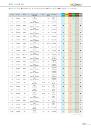Selection Guide Indice grafico Auswahlhilfe Indice graphique Índice gráfico Руководство по выбору RANGE NORM TYPE MATERIAL /COATING HRC HELIXANGLEGEOMETRY Z ISO P ISO M ISO K ISO N ISO S ISO H 1-12 OSAWA ALU MGPOLISHED 40° BALLNOSE 2 H 0.3-2 OSAWA MEX UMGENDLESS ORANGE<55 40° SQUARE 2 H H H 0.2-0.9 OSAWA MEX UMGENDLESS ORANGE<55 40° SQUARE 2 H H H 0.2-4 OSAWA MEX UMGENDLESS ORANGE<55 40° SQUARE 2 H H H 1-20 OSAWA MEX UMGENDLESS ORANGE<55 40° SQUARE 2 H H H 1-12 OSAWA MEX UMGENDLESS ORANGE<55 40° SQUARE 2 H H H 1-25 OSAWA MEX UP UMGENDLESS ORANGE<55 40° SQUARE 4 H H H 2-25 OSAWA MEX UMGENDLESS ORANGE<55 30°-40° SQUARE 4 H H H 3-20 OSAWA MEX UMGENDLESS ORANGE<55 50° SQUARE 6-8 H H H 3-20 OSAWA MEX UMGENDLESS ORANGE<55 50° SQUARE 6-8 H H H 6-20 OSAWA MEX - HR UMGENDLESS ORANGE<55 20° SQUARE 3-4 H H H 0.3-4 OSAWA MEX UMGENDLESS ORANGE<55 40° CORNERRADIUS 2 H H H 2-16 OSAWA MEX UMGENDLESS ORANGE<55 40° CORNERRADIUS 2 H H H 1-20 OSAWA MEX UMGENDLESS ORANGE<55 40° CORNERRADIUS 4 H H H 2-12 OSAWA MEX UMGENDLESS ORANGE<55 30° CORNERRADIUS 4 H H H 2-16 OSAWA MEX UMGENDLESS ORANGE<55 40° CORNERRADIUS 4 H H H 6-12 OSAWA MEX UMGENDLESS ORANGE<55 45° CORNERRADIUS 6 H H H 6-12 OSAWA MEX UMGENDLESS ORANGE<55 45° CORNERRADIUS 6 H H H 0.2-2 OSAWA MH NMGMH COAT 30÷70 30° BALLNOSE 2 H H H 0.2-0.8 OSAWA MH NMGMH COAT 30÷70 30° BALLNOSE 2 H H H 0.2-4 OSAWA MH NMGMH COAT 30÷70 30° BALLNOSE 2 H H H 0.5-2 OSAWA MH NMGMH COAT 30÷70 30° BALLNOSE 2 H H H 1-20 OSAWA MEX UMGENDLESS ORANGE<55 30° BALLNOSE 2 H H H 1-20 OSAWA MEX UMGENDLESS ORANGE<55 30° BALLNOSE 2 H H H 1-20 OSAWA MEX UMGENDLESS ORANGE<55 30° BALLNOSE 2 H H H 0.1-0.9 OSAWA UH NMGUH RED <70 40° SQUARE 2 I I H 0.2-4 OSAWA UH NMGUH RED <70 40° SQUARE 2 I I H H 1st choice I suitable 291