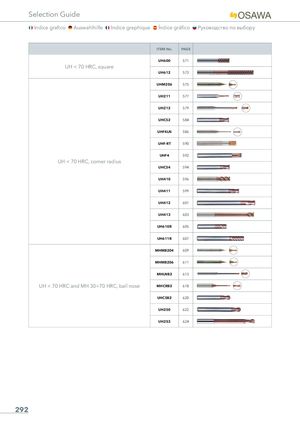 Selection Guide Indice grafico Auswahlhilfe Indice graphique Índice gráfico Руководство по выбору ITEM No. PAGE UH600 571 UH < 70 HRC, square UH612 573 UHM206 575 UH211 577 UH212 579 UHCS2 584 UHF4LN 586 UHF-RT 590 UHF4 592 UH < 70 HRC, corner radius UHCS4 594 UH410 596 UH411 599 UH412 601 UH413 603 UH610R 605 UH611R 607 MHMB204 609 MHMB206 611 MHLNB2 613 UH < 70 HRC and MH 30÷70 HRC, ball nose MHCRB2 618 UHCSB2 620 UH250 622 UH253 624 292