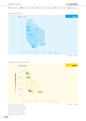 System charts Grafici applicativi Anwendungsgrafiken Graphiques d’application Gráficos aplicativos Диаграммы STEEL APPLICATION HRC Hardness ISO P UH, 60 MEX+ 50 HF MH+ Hard+ 40 MEF+ 30 HF Uni+ 20 G2+ MDTA+ 50 100 150 200 Vc [m/min] H 1st choice I suitable STAINLESS STEEL APPLICATION Machinability ISO M low HF Hard+ medium MEF+ low medium medium high G2, MDTA, HF Uni+ high 40 80 120 160 Vc [m/min] G2 : general purpose (page 298) H 1st choice I suitable MDTA : general purpose (page 344) HF UNI : universal purpose (page 370) HF HARD : special purpose (page 443) MEF : special purpose (page 464) MEX : special purpose (page 504) MH : special purpose (page 546/609) UH :special purpose (page 564) 294