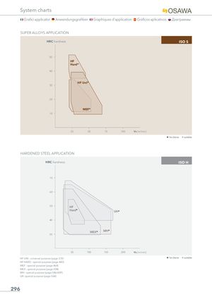System charts Grafici applicativi Anwendungsgrafiken Graphiques d’application Gráficos aplicativos Диаграммы SUPER ALLOYS APPLICATION HRC hardness ISO S 50 HF Hard+ 40 HF Uni+ 30 20 MEF+ 10 25 50 75 100 Vc [m/min] H 1st choice I suitable HARDENED STEEL APPLICATION HRC hardness ISO H 70 60 50 HF Hard+ UH+ 40 MEX+ MH+ 30 50 100 150 200 Vc [m/min] HF UNI : universal purpose (page 370) H 1st choice I suitable HF HARD : special purpose (page 443) MEF : special purpose (page 464) MEX : special purpose (page 504) MH : special purpose (page 546/609) UH :special purpose (page 564) 296