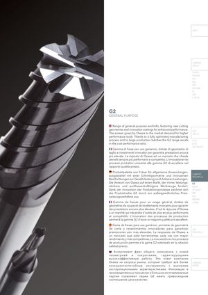 INFO CARBIDE DRILLS PU-HPU TA-4HTA SUH ALH HRC SUH MINI HL HSD C-SD-TA G2 GENERAL PURPOSE Range of general-purpose endmills, featuring new cutting geometries and innovative coatings for enhanced performance. HSS The answer given by Osawa to the market demand for higher DRILLS performance tools. Thanks to a fully optimized manufacturing process and to large production batches the G2 range excels LFTA in the cost-performance ratio. SUTA HSS-HSS/CO Gamma di frese per uso generico, dotate di geometria di taglio e rivestimenti innovativi per garantire prestazioni ancora più elevate. La risposta di Osawa ad un mercato che chiede utensili sempre più performanti e competitivi. L'innovazione nei processi produttivi consente alla gamma G2 di eccellere nel rapporto qualità-prezzo. Produktpalette von Fräser für allgemeine Anwendungen, ausgestattet mit einer Schnittgeometrie und innovativen CARBIDEEND-MILLS Beschichtungen zur Gewährleistung noch höheren Leistungen. Die Antwort von Osawa auf einen Markt, der immer leistungs- G2 stärkere und wettbewerbsfähigere Werkzeuge fordert. MDTA Dank der Innovation der Produktionsprozesse zeichnet sich HF VH/UP die Produktreihe G2 durch ein außergewöhnliches Preis- MEF Leistungsverhältnis aus. ALU MEX/MH Gamme de fraises pour un usage général, dotées de UH/MH géométrie de coupe et de revêtements innovants pour garantir des prestations encore plus élevées. C'est la réponse d'Osawa à un marché qui nécessite d'outils de plus en plus performants et compétitifs. L'innovation des processus de production permet à la gamme G2 d’avoir un rapport qualité-prix excellent. Gama de fresas para uso genérico, provistas de geometría de corte y revestimientos innovadores para garantizar HSS prestaciones aún más elevadas. La respuesta de Osawa a END-MILLS un mercado que pide herramientas cada vez con mayor rendimiento y más competitivas. La innovación en los procesos de producción permite a la gama G2 sobresalir en la relación calidad-precio. Ассортимент фрез общего назначения, с новой геометрией и покрытиями, гарантирующими высокоэффективную работу. Это ответ компании Osawa на запросы рынка, который требует всё более CARBIDE конкурентоспособные инструменты с высокими BURRS эксплуатационными характеристиками. Инновации в производственных процессах и большие изготавливаемые партии позволяют серии G2 иметь превосходное соотношение цена-качество.