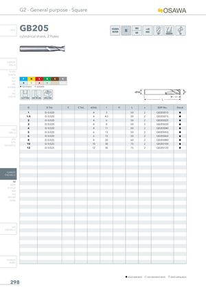 G2 - General purpose - Square INFO GB205 OSAWA <45NORMHRC cylindrical shank, 2 flutes CARBIDE DRILLS PU-HPU TA-4HTA SUH P M K N S H ALH HRC H I H I SUH MINI H 1st choice I suitable HL HSD C-SD-TA SLOTTING SIDE MILLING DRILLING D D Tol. C C Tol. d(h6) l l1 L z EDP No. Stock 1 0/-0.020 4 3 50 2 GB205010 h 1.5 0/-0.020 4 4.5 50 2 GB205015 h 2 0/-0.020 4 6 50 2 GB205020 h 3 0/-0.020 4 8 50 2 GB205030 h 4 0/-0.020 4 11 50 2 GB205040 h HSS DRILLS 5 0/-0.020 6 13 50 2 GB205050 h 6 0/-0.020 6 15 50 2 GB205060 h LFTA 8 0/-0.025 8 20 60 2 GB205080 h SUTAHSS-HSS/CO10 0/-0.025 10 30 75 2 GB205100 h 12 0/-0.025 12 30 75 2 GB205120 h CARBIDE END-MILLS G2 MDTA HF VH/UP MEF ALU MEX/MH UH/MH HSS END-MILLS CARBIDE BURRS h stock standard f non-standard stock m stock exhaustion 298