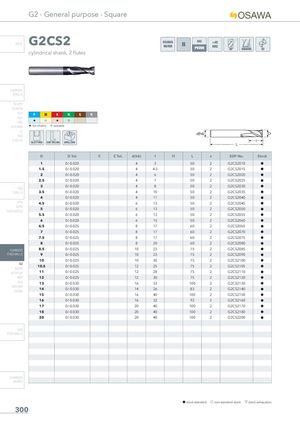 G2 - General purpose - Square INFO G2CS2 OSAWA <45NORMHRC cylindrical shank, 2 flutes CARBIDE DRILLS PU-HPU TA-4HTA SUH P M K N S H ALH HRC H I H I SUH MINI H 1st choice I suitable HL HSD C-SD-TA SLOTTING SIDE MILLING DRILLING D D Tol. C C Tol. d(h6) l l1 L z EDP No. Stock 1 0/-0.020 4 3 50 2 G2CS2010 h 1.5 0/-0.020 4 4.5 50 2 G2CS2015 h 2 0/-0.020 4 6 50 2 G2CS2020 h 2.5 0/-0.020 4 7 50 2 G2CS2025 h 3 0/-0.020 4 8 50 2 G2CS2030 h HSS DRILLS 3.5 0/-0.020 4 10 50 2 G2CS2035 h 4 0/-0.020 4 11 50 2 G2CS2040 h LFTA 4.5 0/-0.020 6 13 50 2 G2CS2045 h SUTAHSS-HSS/CO 5 0/-0.020 6 13 50 2 G2CS2050 h 5.5 0/-0.020 6 13 50 2 G2CS2055 h 6 0/-0.020 6 15 50 2 G2CS2060 h 6.5 0/-0.025 8 17 60 2 G2CS2065 h 7 0/-0.025 8 17 60 2 G2CS2070 h 7.5 0/-0.025 8 17 60 2 G2CS2075 h 8 0/-0.025 8 20 60 2 G2CS2080 h CARBIDE 8.5 0/-0.025 10 23 75 2 G2CS2085 h END-MILLS 9 0/-0.025 10 23 75 2 G2CS2090 h 10 0/-0.025 10 30 75 2 G2CS2100 h G2 10.5 0/-0.025 12 25 75 2 G2CS2105 h MDTA HF VH/UP 11 0/-0.025 12 28 75 2 G2CS2110 h MEF 12 0/-0.025 12 30 75 2 G2CS2120 h ALU 13 0/-0.030 16 33 100 2 G2CS2130 h MEX/MHUH/MH 14 0/-0.030 14 26 83 2 G2CS2140 h 15 0/-0.030 16 40 100 2 G2CS2150 h 16 0/-0.030 16 32 92 2 G2CS2160 h 17 0/-0.030 20 40 100 2 G2CS2170 h 18 0/-0.030 20 40 100 2 G2CS2180 h 20 0/-0.030 20 40 100 2 G2CS2200 h HSS END-MILLS CARBIDE BURRS h stock standard f non-standard stock m stock exhaustion 300