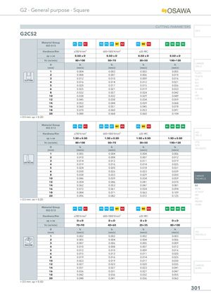 G2 - General purpose - Square CUTTING PARAMETERS INFO G2CS2 Material GroupISO 513 P1 P2 K1 P3 P4 P7 M1 K2 P5 M2 K3 N1 N2 N3 N4 Hardness/Rm ≤700 N/mm² 600÷1000 N/mm² ≤35 HRC ap x ae 0.5D x D 0.5D x D 0.5D x D 0.5D x D Vc (m/min) 80÷100 50÷70 30÷50 100÷120 D fz(mm)(mm/z) fz(mm/z) fz(mm/z) fz(mm/z) CARBIDEDRILLS 1 0.004 0.003 0.003 0.005 PU-HPU 2 0.008 0.007 0.006 0.010 TA-4HTA 3SLOTTING4 0.0120.016 0.0100.014 0.0090.012 0.016 SUH0.021ALH 5 0.020 0.017 0.015 0.026 HRC 6 0.025 0.021 0.019 0.033 SUH MINI 8 0.032 0.027 0.024 0.042 HL 10 0.038 0.032 0.029 0.049 HSD 12 0.045 0.038 0.034 0.059 C-SD-TA 14 0.052 0.044 0.039 0.068 16 0.060 0.051 0.045 0.078 18 0.070 0.060 0.053 0.091 20 0.080 0.068 0.060 0.104 < D3 mm: ap = 0.2D Material Group P1 P2 K1 P3 P4 P7 M1 K2 P5 M2 K3 N1 N2 N3 N4 ISO 513 Hardness/Rm ≤700 N/mm² 600÷1000 N/mm² ≤35 HRC HSSDRILLS ap x ae 1.5D x 0.5D 1.5D x 0.5D 1.5D x 0.5D 1.5D x 0.5D Vc (m/min) 80÷100 50÷70 30÷50 100÷120 LFTA SUTA D fz fz fz fz HSS-HSS/CO (mm) (mm/z) (mm/z) (mm/z) (mm/z) 1 0.005 0.004 0.004 0.006 2 0.010 0.008 0.007 0.012 3 0.014 0.012 0.011 0.019 SIDE MILLING 4 0.019 0.016 0.014 0.025 5 0.024 0.020 0.018 0.031 6 0.030 0.026 0.023 0.039 8 0.038 0.033 0.029 0.050 CARBIDE 10 0.046 0.039 0.034 0.059 END-MILLS 12 0.054 0.046 0.041 0.070 14 0.062 0.053 0.047 0.081 G2 16 0.072 0.061 0.054 0.094 MDTA 18 0.084 0.071 0.063 0.109 HF VH/UP 20 0.096 0.082 0.072 0.125 MEF < D3 mm: ae = 0.2D ALU MEX/MH UH/MH Material GroupISO 513 P1 P2 K1 P3 P4 P7 M1 K2 P5 M2 K3 N1 N2 N3 N4 Hardness/Rm ≤700 N/mm² 600÷1000 N/mm² ≤35 HRC ap x ae DxD DxD DxD DxD Vc (m/min) 70÷90 40÷60 25÷35 80÷100 D fz fz fz fz (mm) (mm/z) (mm/z) (mm/z) (mm/z) HSS 1 0.002 0.002 0.002 0.003 END-MILLS 2 0.005 0.004 0.004 0.006 3 0.007 0.006 0.005 0.009 DRILLING 4 0.010 0.008 0.007 0.012 5 0.012 0.010 0.009 0.016 6 0.015 0.013 0.011 0.020 8 0.019 0.016 0.014 0.025 10 0.023 0.019 0.017 0.030 12 0.027 0.023 0.020 0.035 CARBIDE 14 0.031 0.027 0.023 0.041 BURRS 16 0.036 0.031 0.027 0.047 18 0.042 0.036 0.032 0.055 20 0.048 0.041 0.036 0.062 < D3 mm: ap = 0.5D 301