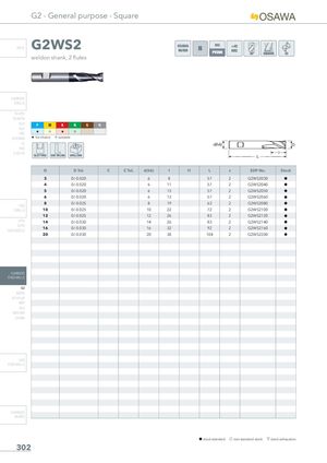 G2 - General purpose - Square INFO G2WS2 OSAWA <45NORMHRC weldon shank, 2 flutes CARBIDE DRILLS PU-HPU TA-4HTA SUH P M K N S H ALH HRC H I H I SUH MINI H 1st choice I suitable HL HSD C-SD-TA SLOTTING SIDE MILLING DRILLING D D Tol. C C Tol. d(h6) l l1 L z EDP No. Stock 3 0/-0.020 6 8 57 2 G2WS2030 h 4 0/-0.020 6 11 57 2 G2WS2040 h 5 0/-0.020 6 13 57 2 G2WS2050 h 6 0/-0.020 6 13 57 2 G2WS2060 h 8 0/-0.025 8 19 63 2 G2WS2080 h HSS DRILLS 10 0/-0.025 10 22 72 2 G2WS2100 h 12 0/-0.025 12 26 83 2 G2WS2120 h LFTA 14 0/-0.030 14 26 83 2 G2WS2140 h SUTAHSS-HSS/CO16 0/-0.030 16 32 92 2 G2WS2160 h 20 0/-0.030 20 38 104 2 G2WS2200 h CARBIDE END-MILLS G2 MDTA HF VH/UP MEF ALU MEX/MH UH/MH HSS END-MILLS CARBIDE BURRS h stock standard f non-standard stock m stock exhaustion 302