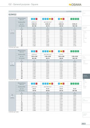 G2 - General purpose - Square CUTTING PARAMETERS INFO G2WS2 Material GroupISO 513 P1 P2 K1 P3 P4 P7 M1 K2 P5 M2 K3 N1 N2 N3 N4 Hardness/Rm ≤700 N/mm² 600÷1000 N/mm² ≤35 HRC ap x ae 0.5D x D 0.5D x D 0.5D x D 0.5D x D Vc (m/min) 80÷100 50÷70 30÷50 100÷120 D fz(mm)(mm/z) fz(mm/z) fz(mm/z) fz(mm/z) CARBIDEDRILLS 3 0.012 0.010 0.009 0.016 PU-HPU 4SLOTTING5 0.0160.020 0.0140.017 0.0120.015 0.021 TA-4HTA0.026SUH 6 0.025 0.021 0.019 0.033 ALH 8 0.032 0.027 0.024 0.042 HRC 10 0.038 0.032 0.029 0.049 SUH MINI 12 0.045 0.038 0.034 0.059 HL 14 0.052 0.044 0.039 0.068 HSD 16 0.060 0.051 0.045 0.078 C-SD-TA 18 0.070 0.060 0.053 0.091 20 0.080 0.068 0.060 0.104 < D3 mm: ap = 0.2D Material Group P1 P2 K1 P3 P4 P7 M1 K2 P5 M2 K3 N1 N2 N3 N4 ISO 513 Hardness/Rm ≤700 N/mm² 600÷1000 N/mm² ≤35 HRC ap x ae 1.5D x 0.5D 1.5D x 0.5D 1.5D x 0.5D 1.5D x 0.5D HSS Vc (m/min) 80÷100 50÷70 30÷50 100÷120 DRILLS D fz fz fz fz (mm) (mm/z) (mm/z) (mm/z) (mm/z) LFTA 3 0.014 0.012 0.011 0.019 SUTAHSS-HSS/CO 4 0.019 0.016 0.014 0.025 SIDE MILLING 5 0.024 0.020 0.018 0.031 6 0.030 0.026 0.023 0.039 8 0.038 0.033 0.029 0.050 10 0.046 0.039 0.034 0.059 12 0.054 0.046 0.041 0.070 14 0.062 0.053 0.047 0.081 16 0.072 0.061 0.054 0.094 CARBIDE 18 0.084 0.071 0.063 0.109 END-MILLS 20 0.096 0.082 0.072 0.125 < D3 mm: ae = 0.2D G2 MDTA Material Group P1 P2 K1 P3 P4 P7 M1 K2 P5 M2 K3ISO 513 HF VH/UPN1N2N3N4MEF ALU Hardness/Rm ≤700 N/mm² 600÷1000 N/mm² ≤35 HRC MEX/MH UH/MH ap x ae DxD DxD DxD DxD Vc (m/min) 70÷90 40÷60 25÷35 80÷100 D fz fz fz fz (mm) (mm/z) (mm/z) (mm/z) (mm/z) 3 0.007 0.006 0.005 0.009 4 0.010 0.008 0.007 0.012 DRILLING 5 0.012 0.010 0.009 0.016 6 0.015 0.013 0.011 0.020 HSS 8 0.019 0.016 0.014 0.025 END-MILLS 10 0.023 0.019 0.017 0.030 12 0.027 0.023 0.020 0.035 14 0.031 0.027 0.023 0.041 16 0.036 0.031 0.027 0.047 18 0.042 0.036 0.032 0.055 20 0.048 0.041 0.036 0.062 < D3 mm: ap = 0.5D CARBIDE BURRS 303
