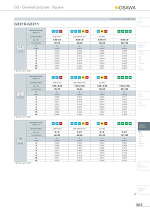 G2 - General purpose - Square CUTTING PARAMETERS INFO G2210-G2211 Material GroupISO 513 P1 P2 K1 P3 P4 P7 M1 K2 P5 M2 K3 N1 N2 N3 N4 Hardness/Rm ≤700 N/mm² 600÷1000 N/mm² ≤35 HRC ap x ae 0.5D x D 0.5D x D 0.5D x D 0.5D x D Vc (m/min) 70÷90 45÷65 30÷50 80÷120 D fz(mm)(mm/z) fz(mm/z) fz(mm/z) fz(mm/z) CARBIDEDRILLS SLOTTING 2 0.007 0.006 0.005 0.009 PU-HPU 3 0.010 0.009 0.008 0.013 TA-4HTA 4 0.014 0.012 0.011 0.018 SUH 5 0.018 0.015 0.014 0.023 ALH 6 0.023 0.019 0.017 0.029 HRC 8 0.030 0.026 0.023 0.039 SUH MINI 10 0.035 0.030 0.026 0.046 HL 12 0.041 0.035 0.031 0.053 HSD < D3 mm: ap = 0.2D C-SD-TA Material Group P1 P2 K1 P3 P4 P7 M1 K2 P5 M2 K3 N1 N2 N3 N4 ISO 513 Hardness/Rm ≤700 N/mm² 600÷1000 N/mm² ≤35 HRC ap x ae 1.5D x 0.5D 1.5D x 0.5D 1.5D x 0.5D 1.5D x 0.5D Vc (m/min) 70÷90 45÷65 30÷50 80÷120 D fz fz fz fz (mm) (mm/z) (mm/z) (mm/z) (mm/z) HSS SIDE MILLING 2 0.008 0.007 0.006 0.011 DRILLS 3 0.012 0.010 0.009 0.016 4 0.017 0.014 0.013 0.022 LFTA 5 0.022 0.018 0.016 0.028 SUTAHSS-HSS/CO 6 0.027 0.023 0.020 0.035 8 0.036 0.031 0.027 0.047 10 0.042 0.036 0.032 0.055 12 0.049 0.042 0.037 0.064 < D3 mm: ae = 0.2D Material Group P1 P2 K1 P3 P4 P7 M1 K2 P5 M2 K3 N1 N2 N3 N4 ISO 513 CARBIDE END-MILLS Hardness/Rm ≤700 N/mm² 600÷1000 N/mm² ≤35 HRC ap x ae DxD DxD DxD DxD G2 Vc (m/min) 60÷80 40÷60 25÷35 70÷100 MDTA HF VH/UP D fz fz fz fz MEF (mm) (mm/z) (mm/z) (mm/z) (mm/z) ALU DRILLING 2 0.004 0.004 0.003 0.005 MEX/MH 3 0.006 0.005 0.005 0.008 UH/MH 4 0.008 0.007 0.006 0.011 5 0.011 0.009 0.008 0.014 6 0.014 0.011 0.010 0.018 8 0.018 0.015 0.014 0.023 10 0.021 0.018 0.016 0.027 12 0.025 0.021 0.018 0.032 < D3 mm: ap = 0.5D HSS END-MILLS CARBIDE BURRS 305