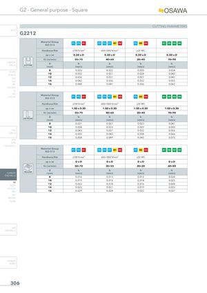 G2 - General purpose - Square CUTTING PARAMETERS INFO G2212 Material GroupISO 513 P1 P2 K1 P3 P4 P7 M1 K2 P5 M2 K3 N1 N2 N3 N4 Hardness/Rm ≤700 N/mm² 600÷1000 N/mm² ≤35 HRC ap x ae 0.3D x D 0.3D x D 0.3D x D 0.3D x D Vc (m/min) 55÷75 40÷60 20÷40 70÷90 CARBIDEDRILLS SLOTTING D(mm) fz(mm/z) fz(mm/z) fz(mm/z) fz(mm/z) 8 0.026 0.022 0.020 0.034 PU-HPU TA-4HTA 10 0.032 0.027 0.024 0.042 SUH 12 0.036 0.031 0.027 0.047 ALH 14 0.042 0.036 0.032 0.055 HRC 16 0.048 0.041 0.036 0.062 SUH MINI HL HSDC-SD-TA Material GroupISO 513 P1 P2 K1 P3 P4 P7 M1 K2 P5 M2 K3 N1 N2 N3 N4 Hardness/Rm ≤700 N/mm² 600÷1000 N/mm² ≤35 HRC ap x ae 1.5D x 0.3D 1.5D x 0.3D 1.5D x 0.3D 1.5D x 0.3D Vc (m/min) 55÷75 40÷60 20÷40 70÷90 D fz fz fz fz SIDE MILLING (mm) (mm/z) (mm/z) (mm/z) (mm/z) 8 0.031 0.027 0.023 0.041 10 0.038 0.033 0.029 0.050 HSS 12 0.043 0.037 0.032 0.056 DRILLS 14 0.050 0.043 0.038 0.066 16 0.058 0.049 0.043 0.075 LFTA SUTA HSS-HSS/CO Material GroupISO 513 P1 P2 K1 P3 P4 P7 M1 K2 P5 M2 K3 N1 N2 N3 N4 Hardness/Rm ≤700 N/mm² 600÷1000 N/mm² ≤35 HRC ap x ae DxD DxD DxD DxD Vc (m/min) 50÷70 35÷55 20÷30 60÷80 D fz fz fz fz CARBIDE DRILLING (mm) (mm/z) (mm/z) (mm/z) (mm/z) END-MILLS 8 0.016 0.013 0.012 0.020 10 0.019 0.016 0.014 0.025 G2 12 0.022 0.018 0.016 0.028 MDTA HF VH/UP 14 0.025 0.021 0.019 0.033 MEF 16 0.029 0.024 0.022 0.037 ALU MEX/MH UH/MH HSS END-MILLS CARBIDE BURRS 306