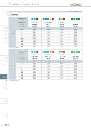 G2 - General purpose - Square CUTTING PARAMETERS INFO G2WSH3 Material GroupISO 513 P1 P2 K1 P3 P4 P7 M1 K2 P5 M2 K3 N1 N2 N3 N4 Hardness/Rm ≤700 N/mm² 600÷1000 N/mm² ≤35 HRC ap x ae 0.5D x D 0.5D x D 0.5D x D 0.5D x D Vc (m/min) 80÷100 50÷70 30÷50 80÷120 CARBIDEDRILLS D fz fz fz fz(mm)(mm/z)(mm/z)(mm/z)(mm/z) 3 0.009 0.008 0.007 0.012 PU-HPU TA-4HTA SLOTTINGSUH 45 0.0130.016 0.0110.013 0.0090.012 0.0160.020 ALH 6 0.019 0.016 0.014 0.024 HRC 8 0.025 0.021 0.019 0.033 SUH MINI 10 0.031 0.027 0.023 0.041 HL 12 0.040 0.034 0.030 0.052 HSD 14 0.046 0.039 0.035 0.060 C-SD-TA 16 0.056 0.048 0.042 0.073 18 0.065 0.055 0.049 0.085 20 0.075 0.064 0.056 0.098 < D3 mm: ap = 0.2D Material Group P1 P2 K1 P3 P4 P7 M1 K2 P5 M2 K3 N1 N2 N3 N4 ISO 513 Hardness/Rm ≤700 N/mm² 600÷1000 N/mm² ≤35 HRC HSS ap x ae 1.5D x 0.3D 1.5D x 0.3D 1.5D x 0.3D 1.5D x 0.3D DRILLS Vc (m/min) 90÷110 60÷80 40÷60 110÷130 D fz fz fz fz LFTA (mm) (mm/z) (mm/z) (mm/z) (mm/z) SUTAHSS-HSS/CO 3 0.011 0.010 0.008 0.015 4 0.015 0.013 0.011 0.020 SIDE MILLING 5 0.019 0.016 0.014 0.024 6 0.023 0.019 0.017 0.029 8 0.030 0.026 0.023 0.039 10 0.038 0.032 0.028 0.049 12 0.048 0.041 0.036 0.062 14 0.056 0.047 0.042 0.072 CARBIDE 16 0.068 0.057 0.051 0.088 END-MILLS 18 0.078 0.066 0.059 0.101 20 0.090 0.077 0.068 0.117 G2 < D3 mm: ae = 0.1D MDTA HF VH/UP MEF ALU MEX/MH UH/MH HSS END-MILLS CARBIDE BURRS 312