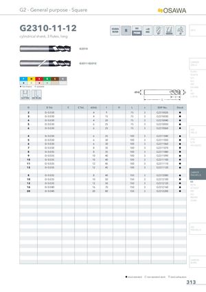 G2 - General purpose - Square G2310-11-12 OSAWA <45NORMHRC INFO cylindrical shank, 3 flutes, long G2310 G2311-G2312 CARBIDEDRILLS PU-HPU TA-4HTA P M K N S H SUH ALH H I H I HRC H 1st choice I suitable SUH MINI HL HSD SLOTTING SIDE MILLING C-SD-TA D D Tol. C C Tol. d(h6) l l1 L z EDP No. Stock 2 0/-0.030 4 9 75 3 G2310020 h 3 0/-0.030 4 15 75 3 G2310030 h 4 0/-0.030 4 20 75 3 G2310040 h 5 0/-0.030 6 25 75 3 G2310050 h 6 0/-0.030 6 25 75 3 G2310060 h HSS DRILLS 4 0/-0.030 6 25 100 3 G2311040 h 5 0/-0.030 6 30 100 3 G2311050 h LFTA 6 0/-0.030 6 30 100 3 G2311060 h SUTAHSS-HSS/CO 7 0/-0.030 8 35 100 3 G2311070 h 8 0/-0.035 8 35 100 3 G2311080 h 9 0/-0.035 10 40 100 3 G2311090 h 10 0/-0.035 10 40 100 3 G2311100 h 11 0/-0.035 12 45 100 3 G2311110 h 12 0/-0.035 12 45 100 3 G2311120 h CARBIDE 8 0/-0.035 8 40 150 3 G2312080 h END-MILLS 10 0/-0.035 10 50 150 3 G2312100 h 12 0/-0.035 12 50 150 3 G2312120 h G2 MDTA 16 0/-0.040 16 70 150 3 G2312160 h HF VH/UP 20 0/-0.040 20 80 150 3 G2312200 h MEF ALU MEX/MH UH/MH HSS END-MILLS CARBIDE BURRS h stock standard f non-standard stock m stock exhaustion 313