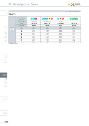 G2 - General purpose - Square CUTTING PARAMETERS INFO GB405 Material GroupISO 513 P1 P2 K1 P3 P4 P7 M1 K2 P5 M2 K3 N1 N2 N3 N4 Hardness/Rm ≤700 N/mm² 600÷1000 N/mm² ≤35 HRC ap x ae 1.5D x 0.2D 1.5D x 0.2D 1.5D x 0.2D 1.5D x 0.2D Vc (m/min) 50÷70 40÷50 20÷40 80÷100 CARBIDEDRILLS D fz fz fz fz(mm)(mm/z)(mm/z)(mm/z)(mm/z) 1 0.003 0.003 0.002 0.004 PU-HPU SIDE MILLINGTA-4HTA 2 0.006 0.006 0.005 0.008 SUH 3 0.010 0.008 0.007 0.013 ALH 4 0.013 0.011 0.010 0.017 HRC 5 0.016 0.014 0.012 0.021 SUH MINI 6 0.020 0.017 0.015 0.026 HL 8 0.026 0.022 0.019 0.034 HSD 10 0.031 0.026 0.023 0.040 C-SD-TA 12 0.036 0.031 0.027 0.047 < D3 mm: ae = 0.1D HSS DRILLS LFTA SUTA HSS-HSS/CO CARBIDE END-MILLS G2 MDTA HF VH/UP MEF ALU MEX/MH UH/MH HSS END-MILLS CARBIDE BURRS 316