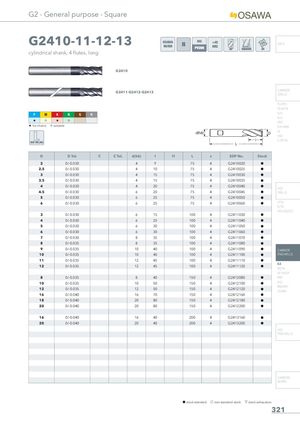 G2 - General purpose - Square G2410-11-12-13 OSAWA <45NORMHRC INFO cylindrical shank, 4 flutes, long G2410 G2411-G2412-G2413 CARBIDEDRILLS PU-HPU TA-4HTA P M K N S H SUH ALH H I H I HRC H 1st choice I suitable SUH MINI HL HSD SIDE MILLING C-SD-TA D D Tol. C C Tol. d(h6) l l1 L z EDP No. Stock 2 0/-0.030 4 9 75 4 G2410020 h 2.5 0/-0.030 4 10 75 4 G2410025 h 3 0/-0.030 4 15 75 4 G2410030 h 3.5 0/-0.030 4 15 75 4 G2410035 h 4 0/-0.030 4 20 75 4 G2410040 h HSS 4.5 0/-0.030 6 20 75 4 G2410045 h DRILLS 5 0/-0.030 6 25 75 4 G2410050 h 6 0/-0.030 6 25 75 4 G2410060 h LFTA SUTA HSS-HSS/CO 3 0/-0.030 6 15 100 4 G2411030 h 4 0/-0.030 6 25 100 4 G2411040 h 5 0/-0.030 6 30 100 4 G2411050 h 6 0/-0.030 6 30 100 4 G2411060 h 7 0/-0.030 8 35 100 4 G2411070 h 8 0/-0.035 8 35 100 4 G2411080 h 9 0/-0.035 10 40 100 4 G2411090 h CARBIDE 10 0/-0.035 10 40 100 4 G2411100 h END-MILLS 11 0/-0.035 12 45 100 4 G2411110 h 12 0/-0.035 12 45 100 4 G2411120 h G2 MDTA HF VH/UP 8 0/-0.035 8 40 150 4 G2412080 h MEF 10 0/-0.035 10 50 150 4 G2412100 h ALU 12 0/-0.035 12 50 150 4 G2412120 h MEX/MHUH/MH 16 0/-0.040 16 70 150 4 G2412160 h 18 0/-0.040 20 80 150 4 G2412180 h 20 0/-0.040 20 80 150 4 G2412200 h 16 0/-0.040 16 40 200 4 G2413160 h 20 0/-0.040 20 40 200 4 G2413200 h HSS END-MILLS CARBIDE BURRS h stock standard f non-standard stock m stock exhaustion 321