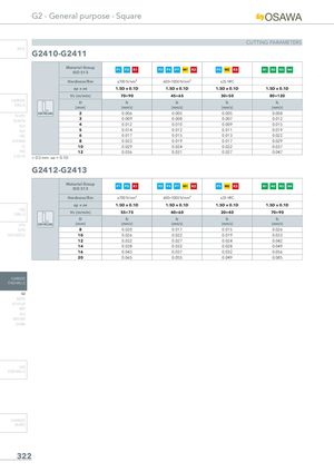 G2 - General purpose - Square CUTTING PARAMETERS INFO G2410-G2411 Material GroupISO 513 P1 P2 K1 P3 P4 P7 M1 K2 P5 M2 K3 N1 N2 N3 N4 Hardness/Rm ≤700 N/mm² 600÷1000 N/mm² ≤35 HRC ap x ae 1.5D x 0.1D 1.5D x 0.1D 1.5D x 0.1D 1.5D x 0.1D Vc (m/min) 70÷90 45÷65 30÷50 80÷120 CARBIDEDRILLS D fz fz fz fz(mm)(mm/z)(mm/z)(mm/z)(mm/z) SIDE MILLING 2 0.006 0.005 0.005 0.008 PU-HPU TA-4HTA 3 0.009 0.008 0.007 0.012 SUH 4 0.012 0.010 0.009 0.015 ALH 5 0.014 0.012 0.011 0.019 HRC 6 0.017 0.015 0.013 0.022 SUH MINI 8 0.023 0.019 0.017 0.029 HL 10 0.029 0.024 0.022 0.037 HSD 12 0.036 0.031 0.027 0.047 C-SD-TA < D3 mm: ae = 0.1D G2412-G2413 Material Group P1 P2 K1 P3 P4 P7 M1 K2 P5 M2 K3 N1 N2 N3 N4 ISO 513 Hardness/Rm ≤700 N/mm² 600÷1000 N/mm² ≤35 HRC ap x ae 1.5D x 0.1D 1.5D x 0.1D 1.5D x 0.1D 1.5D x 0.1D HSSDRILLS Vc (m/min) 55÷75 40÷60 20÷40 70÷90 D fz fz fz fz LFTA SIDE MILLING (mm) (mm/z) (mm/z) (mm/z) (mm/z) SUTA 8 0.020 0.017 0.015 0.026 HSS-HSS/CO 10 0.026 0.022 0.019 0.033 12 0.032 0.027 0.024 0.042 14 0.038 0.032 0.028 0.049 16 0.043 0.037 0.032 0.056 20 0.065 0.055 0.049 0.085 CARBIDE END-MILLS G2 MDTA HF VH/UP MEF ALU MEX/MH UH/MH HSS END-MILLS CARBIDE BURRS 322