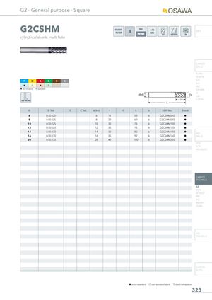 G2 - General purpose - Square G2CSHM OSAWA <45NORMHRC INFO cylindrical shank, multi flute CARBIDE DRILLS PU-HPU TA-4HTA P M K N S H SUH ALH H I H I HRC H 1st choice I suitable SUH MINI HL HSD SIDE MILLING C-SD-TA D D Tol. C C Tol. d(h6) l l1 L z EDP No. Stock 6 0/-0.020 6 15 50 6 G2CSHM060 h 8 0/-0.025 8 20 60 6 G2CSHM080 h 10 0/-0.025 10 30 75 6 G2CSHM100 h 12 0/-0.025 12 30 75 6 G2CSHM120 h 14 0/-0.030 14 30 83 6 G2CSHM140 h HSS 16 0/-0.030 16 35 92 6 G2CSHM160 h DRILLS 20 0/-0.030 20 40 100 6 G2CSHM200 h LFTA SUTA HSS-HSS/CO CARBIDE END-MILLS G2 MDTA HF VH/UP MEF ALU MEX/MH UH/MH HSS END-MILLS CARBIDE BURRS h stock standard f non-standard stock m stock exhaustion 323