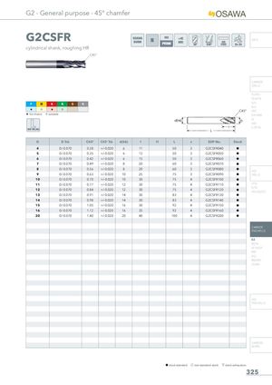 G2 - General purpose - 45° chamfer G2CSFR OSAWA <45NORMHRC INFO cylindrical shank, roughing HR C45° CARBIDE DRILLS PU-HPU TA-4HTA P M K N S H SUH ALH H I H I C45° HRC H 1st choice I suitable SUH MINI HL HSD SIDE MILLING C-SD-TA D D Tol. C45° C45° Tol. d(h6) l l1 L z EDP No. Stock 4 0/-0.070 0.28 +/-0.020 6 11 50 3 G2CSFR040 h 5 0/-0.070 0.35 +/-0.020 6 13 50 3 G2CSFR050 h 6 0/-0.070 0.42 +/-0.020 6 15 50 3 G2CSFR060 h 7 0/-0.070 0.49 +/-0.020 8 20 60 3 G2CSFR070 h 8 0/-0.070 0.56 +/-0.020 8 20 60 3 G2CSFR080 h HSS 9 0/-0.070 0.63 +/-0.020 10 25 75 3 G2CSFR090 h DRILLS 10 0/-0.070 0.70 +/-0.020 10 30 75 4 G2CSFR100 h 11 0/-0.070 0.77 +/-0.020 12 30 75 4 G2CSFR110 h LFTA 12 0/-0.070 0.84 +/-0.020 12 30 75 4 G2CSFR120 h SUTAHSS-HSS/CO 13 0/-0.070 0.91 +/-0.020 14 30 83 4 G2CSFR130 h 14 0/-0.070 0.98 +/-0.020 14 30 83 4 G2CSFR140 h 15 0/-0.070 1.05 +/-0.020 16 30 92 4 G2CSFR150 h 16 0/-0.070 1.12 +/-0.020 16 35 92 4 G2CSFR160 h 20 0/-0.070 1.40 +/-0.020 20 40 100 4 G2CSFR200 h CARBIDE END-MILLS G2 MDTA HF VH/UP MEF ALU MEX/MH UH/MH HSS END-MILLS CARBIDE BURRS h stock standard f non-standard stock m stock exhaustion 325