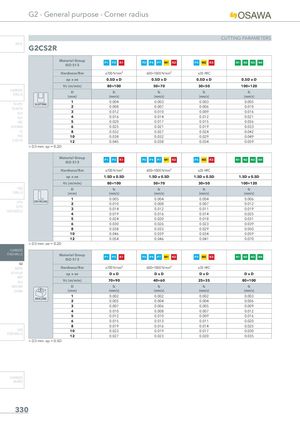 G2 - General purpose - Corner radius CUTTING PARAMETERS INFO G2CS2R Material GroupISO 513 P1 P2 K1 P3 P4 P7 M1 K2 P5 M2 K3 N1 N2 N3 N4 Hardness/Rm ≤700 N/mm² 600÷1000 N/mm² ≤35 HRC ap x ae 0.5D x D 0.5D x D 0.5D x D 0.5D x D Vc (m/min) 80÷100 50÷70 30÷50 100÷120 CARBIDEDRILLS D fz fz fz fz(mm)(mm/z)(mm/z)(mm/z)(mm/z) 1 0.004 0.003 0.003 0.005 PU-HPU SLOTTINGTA-4HTA 2 0.008 0.007 0.006 0.010 SUH 3 0.012 0.010 0.009 0.016 ALH 4 0.016 0.014 0.012 0.021 HRC 5 0.020 0.017 0.015 0.026 SUH MINI 6 0.025 0.021 0.019 0.033 HL 8 0.032 0.027 0.024 0.042 HSD 10 0.038 0.032 0.029 0.049 C-SD-TA 12 0.045 0.038 0.034 0.059 < D3 mm: ap = 0.2D Material Group P1 P2 K1 P3 P4 P7 M1 K2 P5 M2 K3 N1 N2 N3 N4 ISO 513 Hardness/Rm ≤700 N/mm² 600÷1000 N/mm² ≤35 HRC ap x ae 1.5D x 0.5D 1.5D x 0.5D 1.5D x 0.5D 1.5D x 0.5D Vc (m/min) 80÷100 50÷70 30÷50 100÷120 HSS D fz fz fz fz DRILLS (mm) (mm/z) (mm/z) (mm/z) (mm/z) 1 0.005 0.004 0.004 0.006 LFTA SIDE MILLING 2 0.010 0.008 0.007 0.012 SUTAHSS-HSS/CO 3 0.014 0.012 0.011 0.019 4 0.019 0.016 0.014 0.025 5 0.024 0.020 0.018 0.031 6 0.030 0.026 0.023 0.039 8 0.038 0.033 0.029 0.050 10 0.046 0.039 0.034 0.059 12 0.054 0.046 0.041 0.070 < D3 mm: ae = 0.2D CARBIDE END-MILLS Material Group P1 P2 K1 P3 P4 P7 M1 K2 P5 M2 K3 N1 N2 N3 N4 ISO 513 G2 MDTA Hardness/Rm ≤700 N/mm² 600÷1000 N/mm² ≤35 HRC HF VH/UP ap x ae DxD DxD DxD DxD MEF ALU Vc (m/min) 70÷90 40÷60 25÷35 80÷100 MEX/MH D fz fz fz fz UH/MH (mm) (mm/z) (mm/z) (mm/z) (mm/z) 1 0.002 0.002 0.002 0.003 DRILLING 2 0.005 0.004 0.004 0.006 3 0.007 0.006 0.005 0.009 4 0.010 0.008 0.007 0.012 5 0.012 0.010 0.009 0.016 6 0.015 0.013 0.011 0.020 8 0.019 0.016 0.014 0.025 HSS 10 0.023 0.019 0.017 0.030 END-MILLS 12 0.027 0.023 0.020 0.035 < D3 mm: ap = 0.5D CARBIDE BURRS 330