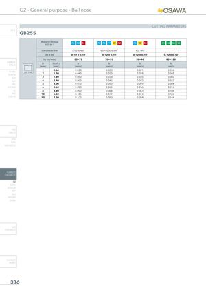 G2 - General purpose - Ball nose CUTTING PARAMETERS INFO GB255 Material GroupISO 513 P1 P2 K1 P3 P4 P7 M1 K2 P5 M2 K3 N1 N2 N3 N4 Hardness/Rm ≤700 N/mm² 600÷1000 N/mm² ≤35 HRC ap x ae 0.1D x 0.1D 0.1D x 0.1D 0.1D x 0.1D 0.1D x 0.1D Vc (m/min) 50÷70 35÷55 20÷40 80÷120 CARBIDEDRILLS D D(eff.) fz(mm)(mm)(mm/z) fz(mm/z) fz(mm/z) fz(mm/z) 1 0.60 0.030 0.023 0.021 0.036 PU-HPU COPYINGTA-4HTA 2 1.20 0.040 0.030 0.028 0.048 SUH 3 1.80 0.050 0.038 0.035 0.060 ALH 4 2.40 0.060 0.045 0.042 0.072 HRC 5 3.00 0.070 0.053 0.049 0.084 SUH MINI 6 3.60 0.080 0.060 0.056 0.096 HL 8 4.80 0.090 0.068 0.063 0.108 HSD 10 6.00 0.105 0.079 0.074 0.126 C-SD-TA 12 7.20 0.120 0.090 0.084 0.144 HSS DRILLS LFTA SUTA HSS-HSS/CO CARBIDE END-MILLS G2 MDTA HF VH/UP MEF ALU MEX/MH UH/MH HSS END-MILLS CARBIDE BURRS 336
