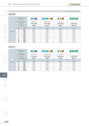 G2 - General purpose - Ball nose CUTTING PARAMETERS INFO G2250 Material GroupISO 513 P1 P2 K1 P3 P4 P7 M1 K2 P5 M2 K3 N1 N2 N3 N4 Hardness/Rm ≤700 N/mm² 600÷1000 N/mm² ≤35 HRC ap x ae 0.1D x 0.1D 0.1D x 0.1D 0.1D x 0.1D 0.1D x 0.1D Vc (m/min) 70÷90 50÷70 40÷50 100÷120 CARBIDEDRILLS D D(eff.) fz(mm)(mm)(mm/z) fz(mm/z) fz(mm/z) fz(mm/z) 1 0.60 0.027 0.020 0.019 0.032 PU-HPU COPYINGTA-4HTA 2 1.20 0.036 0.027 0.025 0.043 SUH 3 1.80 0.045 0.034 0.032 0.054 ALH 4 2.40 0.054 0.041 0.038 0.065 HRC 5 3.00 0.063 0.047 0.044 0.076 SUH MINI 6 3.60 0.072 0.054 0.050 0.086 HL 8 4.80 0.081 0.061 0.057 0.097 HSD 10 6.00 0.095 0.071 0.066 0.113 C-SD-TA 12 7.20 0.108 0.081 0.076 0.130 G2251 Material Group P1 P2 K1 P3 P4 P7 M1 K2 P5 M2 K3 N1 N2 N3 N4 ISO 513 Hardness/Rm ≤700 N/mm² 600÷1000 N/mm² ≤35 HRC HSS ap x ae 0.1D x 0.1D 0.1D x 0.1D 0.1D x 0.1D 0.1D x 0.1D DRILLS Vc (m/min) 60÷80 40÷60 35÷45 90÷110 LFTA D D(eff.) fz fz fz fz SUTA COPYING (mm) (mm) (mm/z) (mm/z) (mm/z) (mm/z) HSS-HSS/CO 6 3.60 0.058 0.044 0.041 0.070 8 4.80 0.066 0.049 0.046 0.079 10 6.00 0.077 0.057 0.054 0.092 12 7.20 0.087 0.066 0.061 0.105 16 9.60 0.122 0.092 0.085 0.146 20 12.00 0.146 0.110 0.102 0.175 CARBIDE END-MILLS G2 MDTA HF VH/UP MEF ALU MEX/MH UH/MH HSS END-MILLS CARBIDE BURRS 340