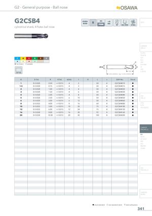 G2 - General purpose - Ball nose G2CSB4 OSAWA <45NORMHRC INFO cylindrical shank, 4 flutes ball nose CARBIDE DRILLS PU-HPU TA-4HTA P M K N S H SUH ALH H I H I R HRC H 1st choice I suitable SUH MINI HL HSD C-SD-TA COPYING D D Tol. R R Tol. d(h6) l l1 L z EDP No. Stock 1 0/-0.020 0.50 +/-0.015 4 2 50 4 G2CSB4010 h 1.5 0/-0.020 0.75 +/-0.015 4 3 50 4 G2CSB4015 h 2 0/-0.020 1.00 +/-0.015 4 4 50 4 G2CSB4020 h 3 0/-0.020 1.50 +/-0.015 4 6 50 4 G2CSB4030 h 4 0/-0.020 2.00 +/-0.015 4 8 50 4 G2CSB4040 h HSS 5 0/-0.020 2.50 +/-0.015 6 10 50 4 G2CSB4050 h DRILLS 6 0/-0.020 3.00 +/-0.015 6 12 50 4 G2CSB4060 h 8 0/-0.025 4.00 +/-0.015 8 16 60 4 G2CSB4080 h LFTA 10 0/-0.025 5.00 +/-0.015 10 20 75 4 G2CSB4100 h SUTAHSS-HSS/CO 12 0/-0.025 6.00 +/-0.015 12 24 75 4 G2CSB4120 h 16 0/-0.030 8.00 +/-0.015 16 30 92 4 G2CSB4160 h 20 0/-0.030 10.00 +/-0.015 20 30 100 4 G2CSB4200 h CARBIDE END-MILLS G2 MDTA HF VH/UP MEF ALU MEX/MH UH/MH HSS END-MILLS CARBIDE BURRS h stock standard f non-standard stock m stock exhaustion 341