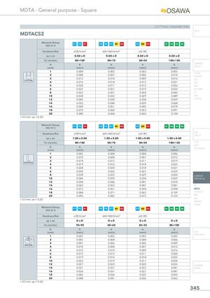 MDTA - General purpose - Square CUTTING PARAMETERS INFO MDTACS2 Material GroupISO 513 P1 P2 K1 P3 P4 P7 M1 K2 P5 M2 K3 N1 N2 N3 N4 Hardness/Rm ≤700 N/mm² 600÷1000 N/mm² ≤35 HRC ap x ae 0.5D x D 0.5D x D 0.5D x D 0.5D x D Vc (m/min) 80÷100 50÷70 30÷50 100÷120 D fz(mm)(mm/z) fz(mm/z) fz(mm/z) fz(mm/z) CARBIDEDRILLS 1 0.004 0.003 0.003 0.005 PU-HPU 2 0.008 0.007 0.006 0.010 TA-4HTA 3SLOTTING4 0.0120.016 0.0100.014 0.0090.012 0.016 SUH0.021ALH 5 0.020 0.017 0.015 0.026 HRC 6 0.025 0.021 0.019 0.033 SUH MINI 8 0.032 0.027 0.024 0.042 HL 10 0.038 0.032 0.029 0.049 HSD 12 0.045 0.038 0.034 0.059 C-SD-TA 14 0.052 0.044 0.039 0.068 16 0.060 0.051 0.045 0.078 18 0.070 0.060 0.053 0.091 20 0.080 0.068 0.060 0.104 < D3 mm: ap = 0.2D Material Group P1 P2 K1 P3 P4 P7 M1 K2 P5 M2 K3 N1 N2 N3 N4 ISO 513 Hardness/Rm ≤700 N/mm² 600÷1000 N/mm² ≤35 HRC HSSDRILLS ap x ae 1.5D x 0.5D 1.5D x 0.5D 1.5D x 0.5D 1.5D x 0.5D Vc (m/min) 80÷100 50÷70 30÷50 100÷120 LFTA SUTA D fz fz fz fz HSS-HSS/CO (mm) (mm/z) (mm/z) (mm/z) (mm/z) 1 0.005 0.004 0.004 0.006 2 0.010 0.008 0.007 0.012 3 0.014 0.012 0.011 0.019 SIDE MILLING 4 0.019 0.016 0.014 0.025 5 0.024 0.020 0.018 0.031 6 0.030 0.026 0.023 0.039 8 0.038 0.033 0.029 0.050 CARBIDE 10 0.046 0.039 0.034 0.059 END-MILLS 12 0.054 0.046 0.041 0.070 14 0.062 0.053 0.047 0.081 G2 16 0.072 0.061 0.054 0.094 MDTA 18 0.084 0.071 0.063 0.109 HF VH/UP 20 0.096 0.082 0.072 0.125 MEF < D3 mm: ae = 0.2D ALU MEX/MH UH/MH Material GroupISO 513 P1 P2 K1 P3 P4 P7 M1 K2 P5 M2 K3 N1 N2 N3 N4 Hardness/Rm ≤700 N/mm² 600÷1000 N/mm² ≤35 HRC ap x ae DxD DxD DxD DxD Vc (m/min) 70÷90 40÷60 25÷35 80÷100 D fz fz fz fz (mm) (mm/z) (mm/z) (mm/z) (mm/z) HSS 1 0.002 0.002 0.002 0.003 END-MILLS 2 0.005 0.004 0.004 0.006 3 0.007 0.006 0.005 0.009 DRILLING 4 0.010 0.008 0.007 0.012 5 0.012 0.010 0.009 0.016 6 0.015 0.013 0.011 0.020 8 0.019 0.016 0.014 0.025 10 0.023 0.019 0.017 0.030 12 0.027 0.023 0.020 0.035 CARBIDE 14 0.031 0.027 0.023 0.041 BURRS 16 0.036 0.031 0.027 0.047 18 0.042 0.036 0.032 0.055 20 0.048 0.041 0.036 0.062 < D3 mm: ap = 0.5D 345