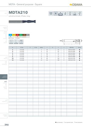 MDTA - General purpose - Square INFO MDTA210 OSAWA <45NORMHRC cylindrical shank, 2 flutes, long CARBIDE DRILLS PU-HPU TA-4HTA SUH P M K N S H ALH HRC H I H I SUH MINI H 1st choice I suitable HL HSD C-SD-TA SLOTTING SIDE MILLING DRILLING D D Tol. C C Tol. d(h6) l l1 L z EDP No. Stock 3 0/-0.030 3 20 60 2 MDTA210030 h 4 0/-0.030 4 20 60 2 MDTA210040 h 5 0/-0.030 5 25 75 2 MDTA210050 h 6 0/-0.030 6 30 75 2 MDTA210060 h 8 0/-0.030 8 30 75 2 MDTA210080 h HSS DRILLS 10 0/-0.030 10 40 100 2 MDTA210100 h 12 0/-0.030 12 45 100 2 MDTA210120 h LFTA SUTA HSS-HSS/CO CARBIDE END-MILLS G2 MDTA HF VH/UP MEF ALU MEX/MH UH/MH HSS END-MILLS CARBIDE BURRS h stock standard f non-standard stock m stock exhaustion 346