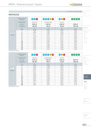 MDTA - General purpose - Square CUTTING PARAMETERS INFO MDTACS3 Material GroupISO 513 P1 P2 K1 P3 P4 P7 M1 K2 P5 M2 K3 N1 N2 N3 N4 Hardness/Rm ≤700 N/mm² 600÷1000 N/mm² ≤35 HRC ap x ae 0.5D x D 0.5D x D 0.5D x D 0.5D x D Vc (m/min) 80÷100 50÷70 30÷50 100÷120 D fz(mm)(mm/z) fz(mm/z) fz(mm/z) fz(mm/z) CARBIDEDRILLS 1 0.004 0.003 0.003 0.005 PU-HPU 2 0.008 0.007 0.006 0.010 TA-4HTA 3SLOTTING4 0.0110.014 0.0090.012 0.0080.011 0.014 SUH0.019ALH 5 0.018 0.015 0.013 0.023 HRC 6 0.021 0.018 0.016 0.027 SUH MINI 8 0.028 0.023 0.021 0.036 HL 10 0.035 0.030 0.026 0.046 HSD 12 0.044 0.037 0.033 0.057 C-SD-TA 14 0.052 0.044 0.039 0.067 16 0.059 0.050 0.045 0.077 18 0.066 0.056 0.050 0.086 20 0.072 0.061 0.054 0.093 < D3 mm: ap = 0.2D Material Group P1 P2 K1 P3 P4 P7 M1 K2 P5 M2 K3 N1 N2 N3 N4 ISO 513 Hardness/Rm ≤700 N/mm² 600÷1000 N/mm² ≤35 HRC HSSDRILLS ap x ae 0.5D x D 0.5D x D 0.5D x D 0.5D x D Vc (m/min) 80÷100 50÷70 30÷50 100÷120 LFTA SUTA D fz fz fz fz HSS-HSS/CO (mm) (mm/z) (mm/z) (mm/z) (mm/z) 1 0.005 0.004 0.003 0.006 2 0.009 0.008 0.007 0.012 3 0.013 0.011 0.010 0.017 SIDE MILLING 4 0.017 0.015 0.013 0.022 5 0.021 0.018 0.016 0.027 6 0.025 0.021 0.019 0.033 8 0.033 0.028 0.025 0.043 CARBIDE 10 0.042 0.036 0.032 0.055 END-MILLS 12 0.053 0.045 0.040 0.069 14 0.062 0.053 0.047 0.081 G2 16 0.071 0.061 0.053 0.093 MDTA 18 0.079 0.067 0.059 0.103 HF VH/UP 20 0.086 0.073 0.064 0.112 MEF < D3 mm: ae = 0.1D ALU MEX/MH UH/MH HSS END-MILLS CARBIDE BURRS 351