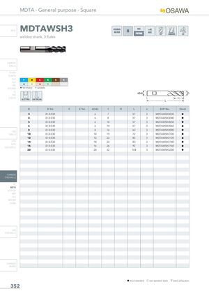 MDTA - General purpose - Square INFO MDTAWSH3 OSAWA <45NORMHRC weldon shank, 3 flutes CARBIDE DRILLS PU-HPU TA-4HTA SUH P M K N S H ALH HRC H I H I SUH MINI H 1st choice I suitable HL HSD C-SD-TA SLOTTING SIDE MILLING D D Tol. C C Tol. d(h6) l l1 L z EDP No. Stock 3 0/-0.030 6 7 57 3 MDTAWSH3030 h 4 0/-0.030 6 8 57 3 MDTAWSH3040 h 5 0/-0.030 6 10 57 3 MDTAWSH3050 h 6 0/-0.030 6 10 57 3 MDTAWSH3060 h 8 0/-0.030 8 16 63 3 MDTAWSH3080 h HSS DRILLS 10 0/-0.030 10 19 72 3 MDTAWSH3100 h 12 0/-0.030 12 22 83 3 MDTAWSH3120 h LFTA 14 0/-0.030 14 22 83 3 MDTAWSH3140 h SUTAHSS-HSS/CO16 0/-0.030 16 26 92 3 MDTAWSH3160 h 20 0/-0.030 20 32 104 3 MDTAWSH3200 h CARBIDE END-MILLS G2 MDTA HF VH/UP MEF ALU MEX/MH UH/MH HSS END-MILLS CARBIDE BURRS h stock standard f non-standard stock m stock exhaustion 352