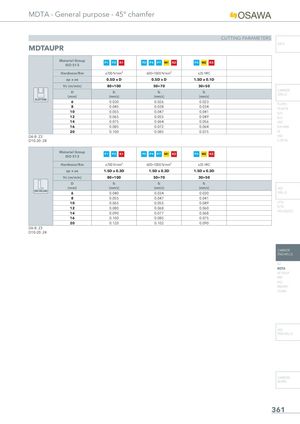 MDTA - General purpose - 45° chamfer CUTTING PARAMETERS INFO MDTAUPR Material GroupISO 513 P1 P2 K1 P3 P4 P7 M1 K2 P5 M2 K3 Hardness/Rm ≤700 N/mm² 600÷1000 N/mm² ≤35 HRC ap x ae 0.5D x D 0.5D x D 1.5D x 0.1D Vc (m/min) 80÷100 50÷70 30÷50 D fz fz fz(mm)(mm/z)(mm/z)(mm/z) CARBIDEDRILLS SLOTTING 6 0.030 0.026 0.023 PU-HPU 8 0.045 0.038 0.034 TA-4HTA 10 0.055 0.047 0.041 SUH 12 0.065 0.055 0.049 ALH 14 0.075 0.064 0.056 HRC 16 0.085 0.072 0.064 SUH MINI 20 0.100 0.085 0.075 HL D6-8: Z3 HSD D10-20: Z4 C-SD-TA Material GroupISO 513 P1 P2 K1 P3 P4 P7 M1 K2 P5 M2 K3 Hardness/Rm ≤700 N/mm² 600÷1000 N/mm² ≤35 HRC ap x ae 1.5D x 0.3D 1.5D x 0.3D 1.5D x 0.3D Vc (m/min) 80÷100 50÷70 30÷50 D fz fz fz (mm) (mm/z) (mm/z) (mm/z) HSS SIDE MILLING 6 0.040 0.034 0.030 DRILLS 8 0.055 0.047 0.041 10 0.065 0.055 0.049 LFTA 12 0.080 0.068 0.060 SUTA 14 0.090 0.077 0.068 HSS-HSS/CO 16 0.100 0.085 0.075 20 0.120 0.102 0.090 D6-8: Z3 D10-20: Z4 CARBIDE END-MILLS G2 MDTA HF VH/UP MEF ALU MEX/MH UH/MH HSS END-MILLS CARBIDE BURRS 361